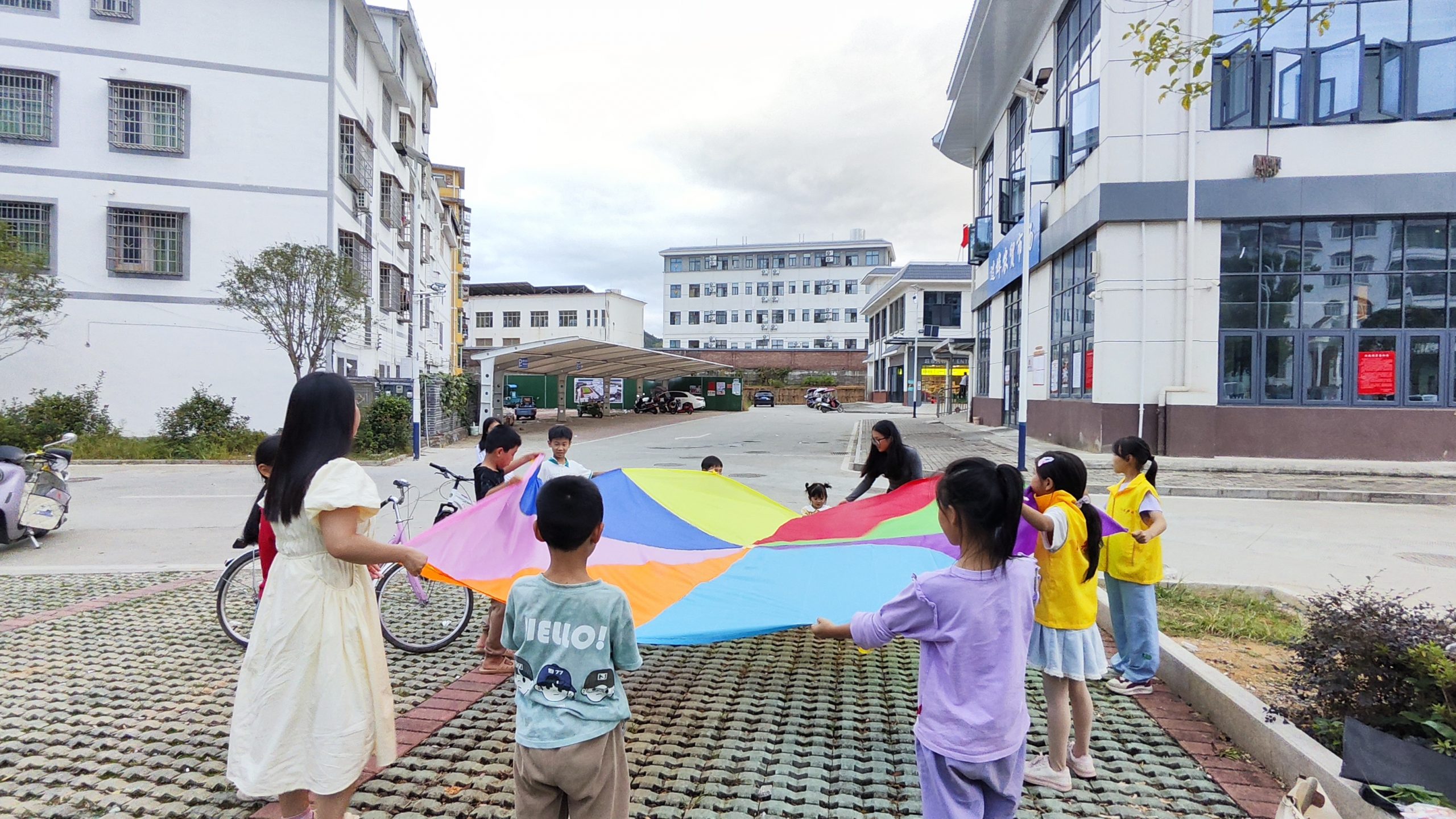 工作人员带领儿童把拾到的叶子放在平铺的彩虹伞的中间,引领儿童拉住彩虹伞的边缘用力抖动,使叶子在彩虹伞里翻跳,或者顺时针或逆时针走动。