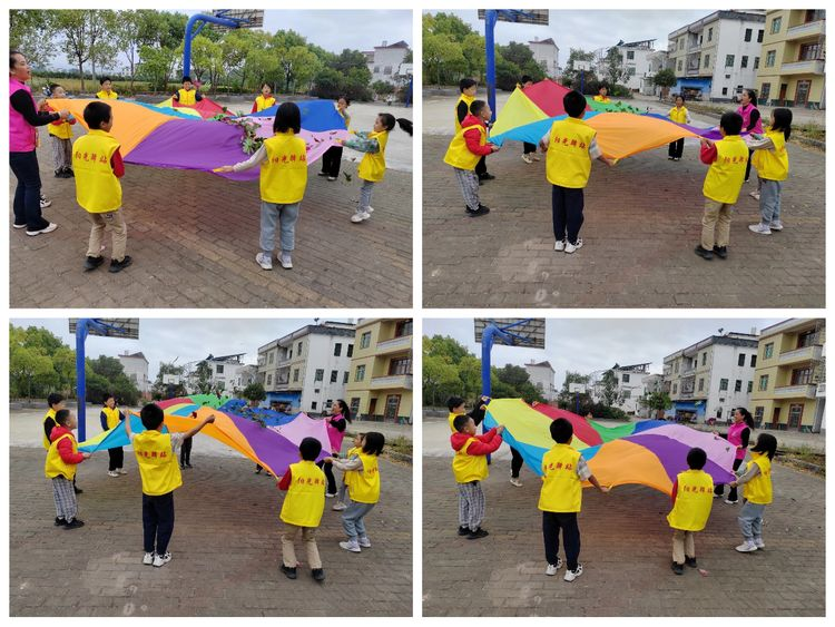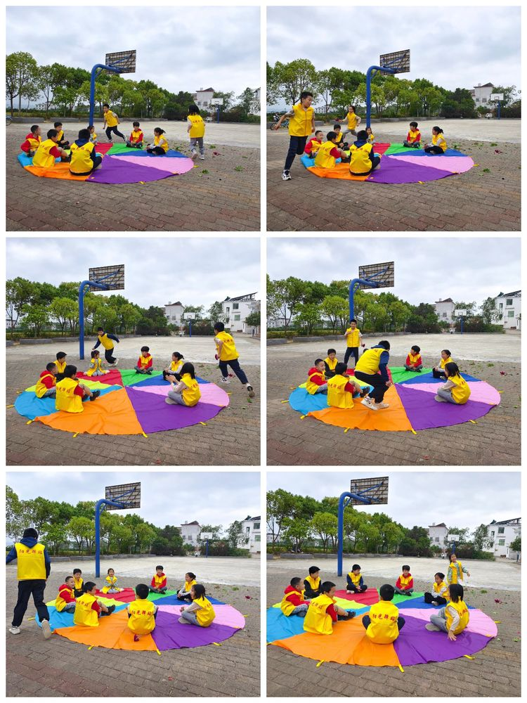 志愿者带领儿童把拾到的叶子放在平铺的彩虹伞的中间引领儿童拉住彩虹伞的边缘用力抖动,使叶子在彩虹伞里翻跳。