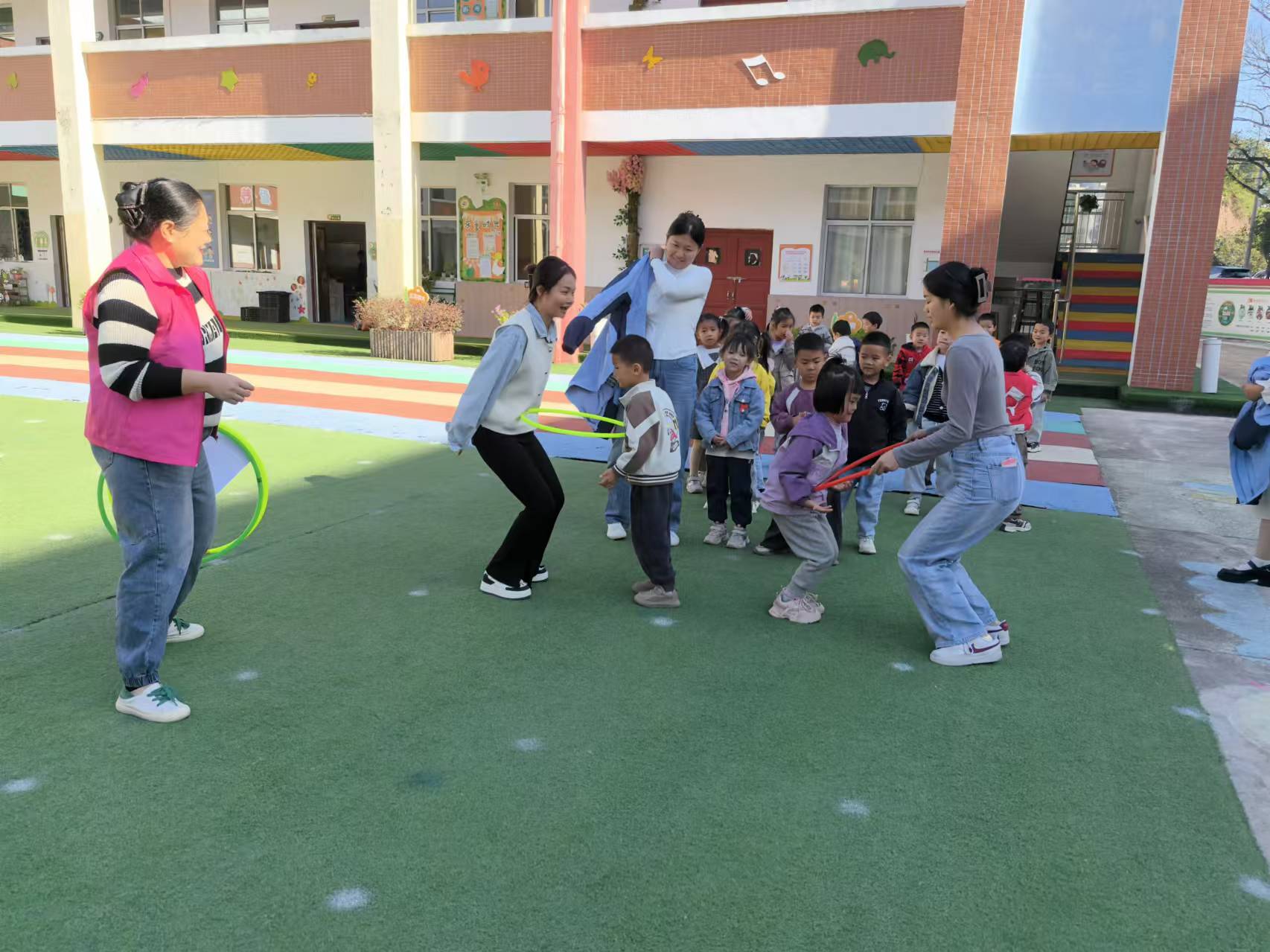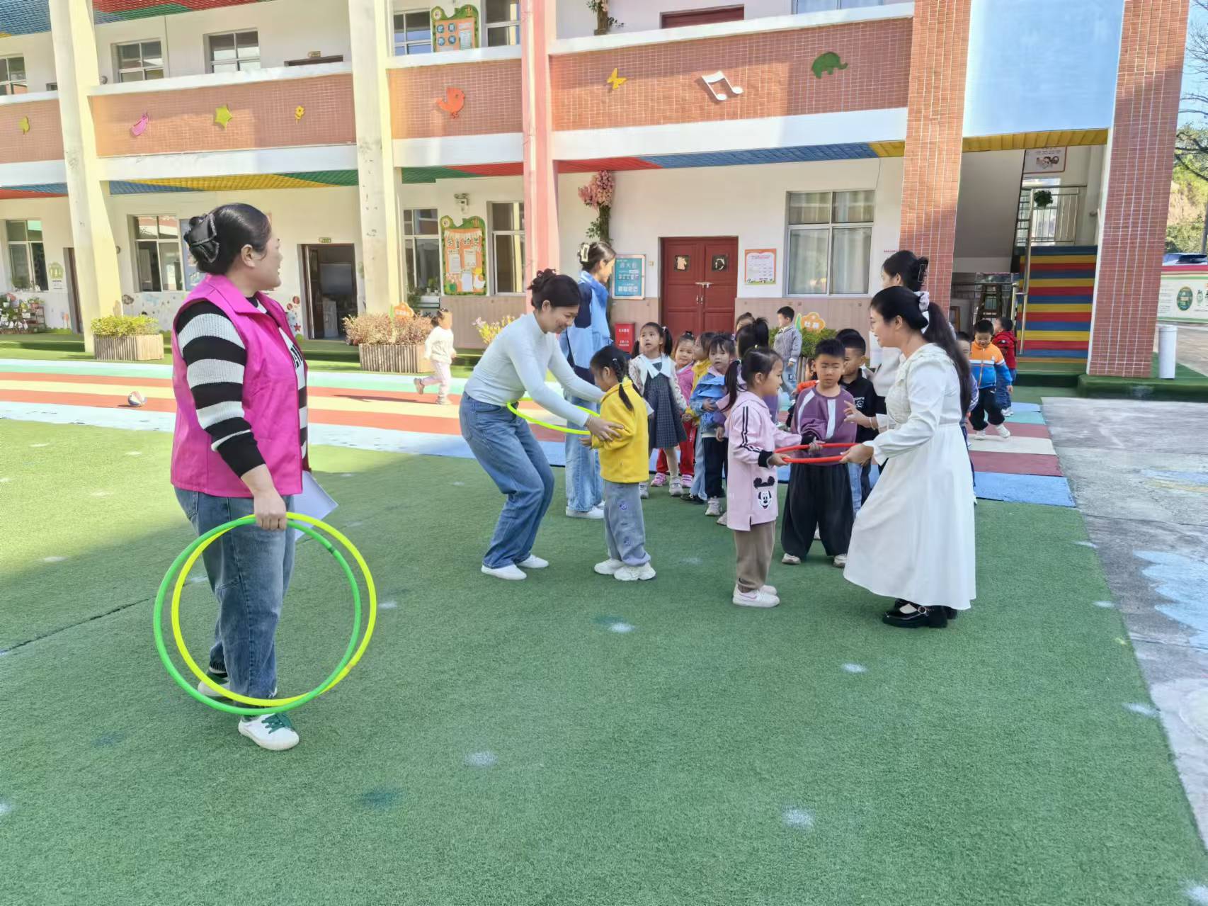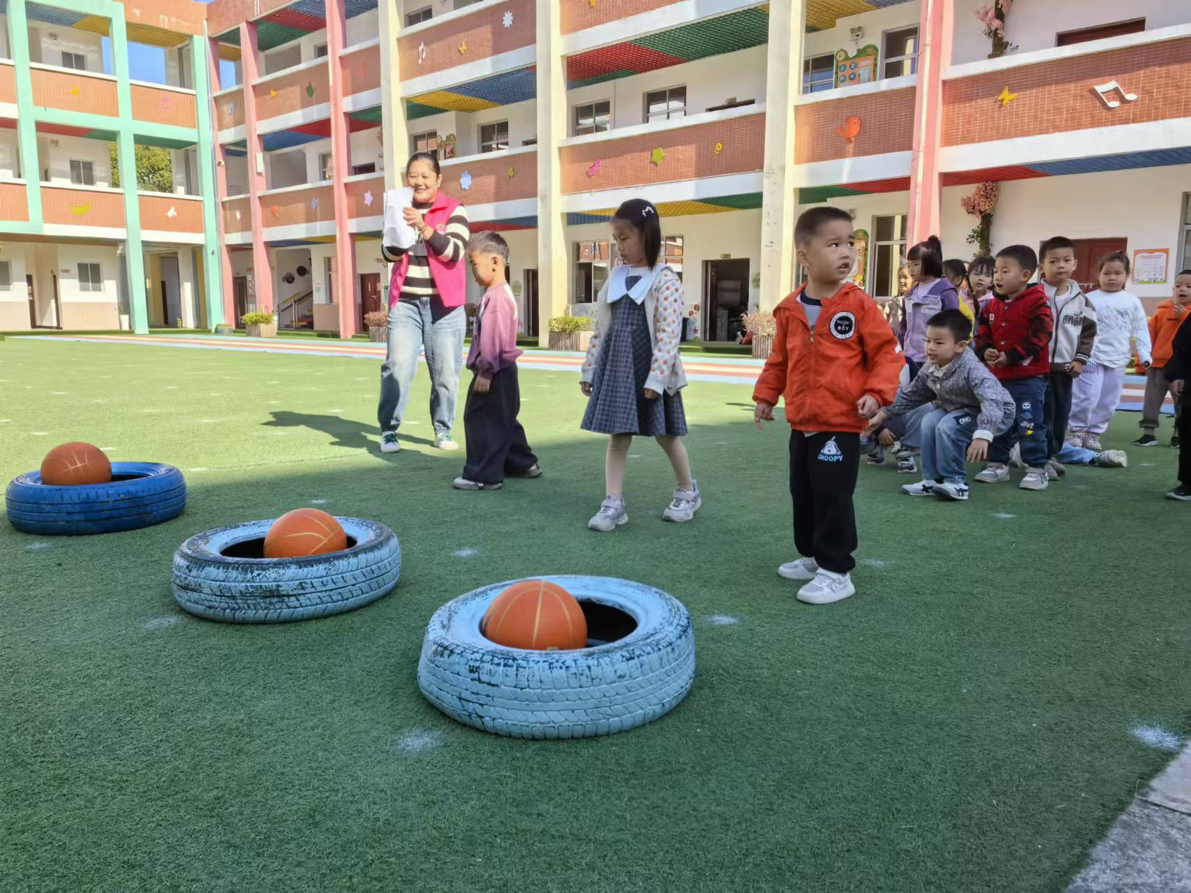 小朋友分为组,每组一个篮球从第一人将球投到指定圈内,传到最后一个人,以投中多的一组为胜。