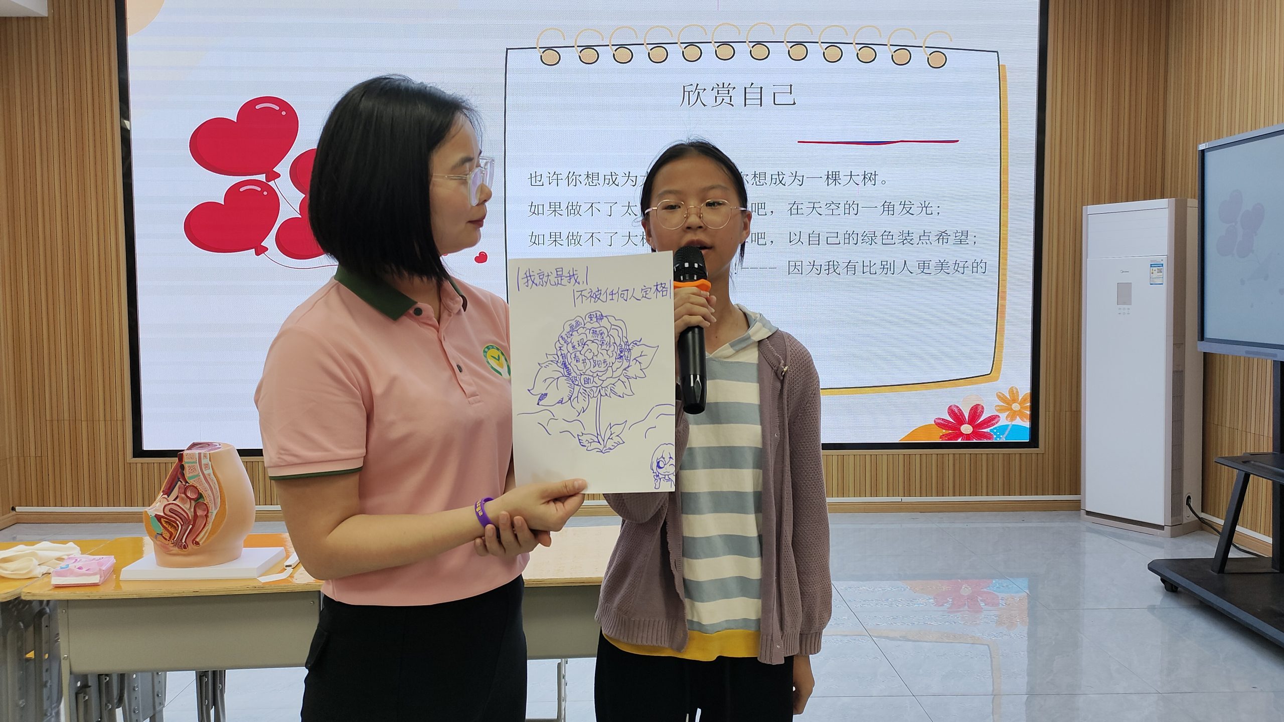 最后,讲座还设置了“送你一朵小红花”互动环节,李老师让在场的女童来用花朵描绘出自己的优点、性格,并邀请她们上台分享花瓣背后的故事,每片花瓣都代表着她们的一个闪光点,让她们在分享中传递自身多样而独特的美。