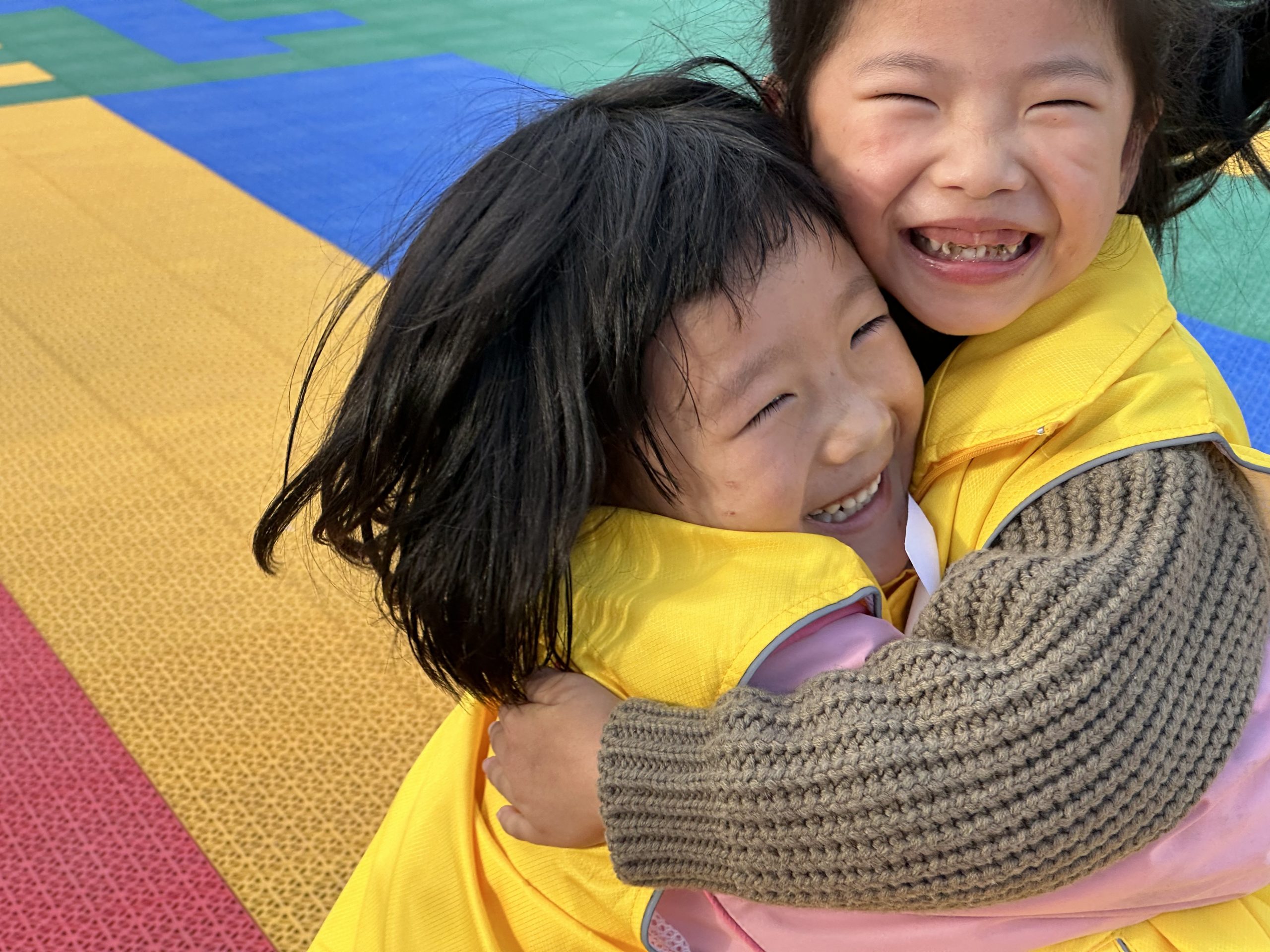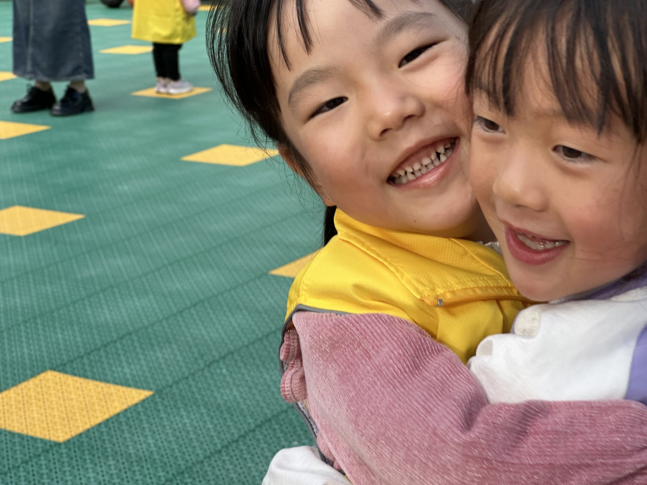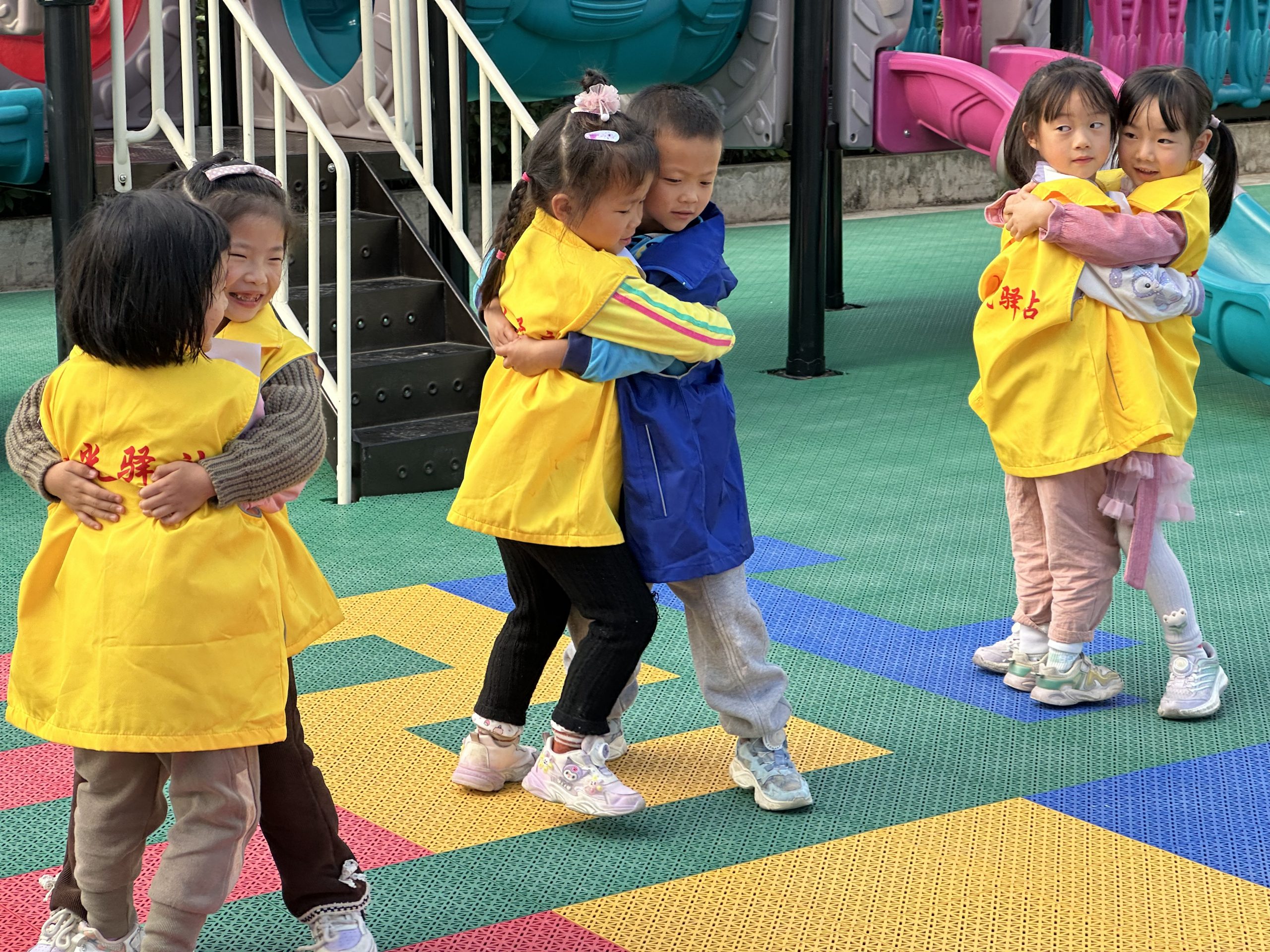 在“齐头并进”游戏中,小朋友们两两合作,因头顶A4纸难度较大,便换成了两个人互相拥抱,把A4纸夹在中间,运送到终点,现场大家呐喊助威,好不热闹!