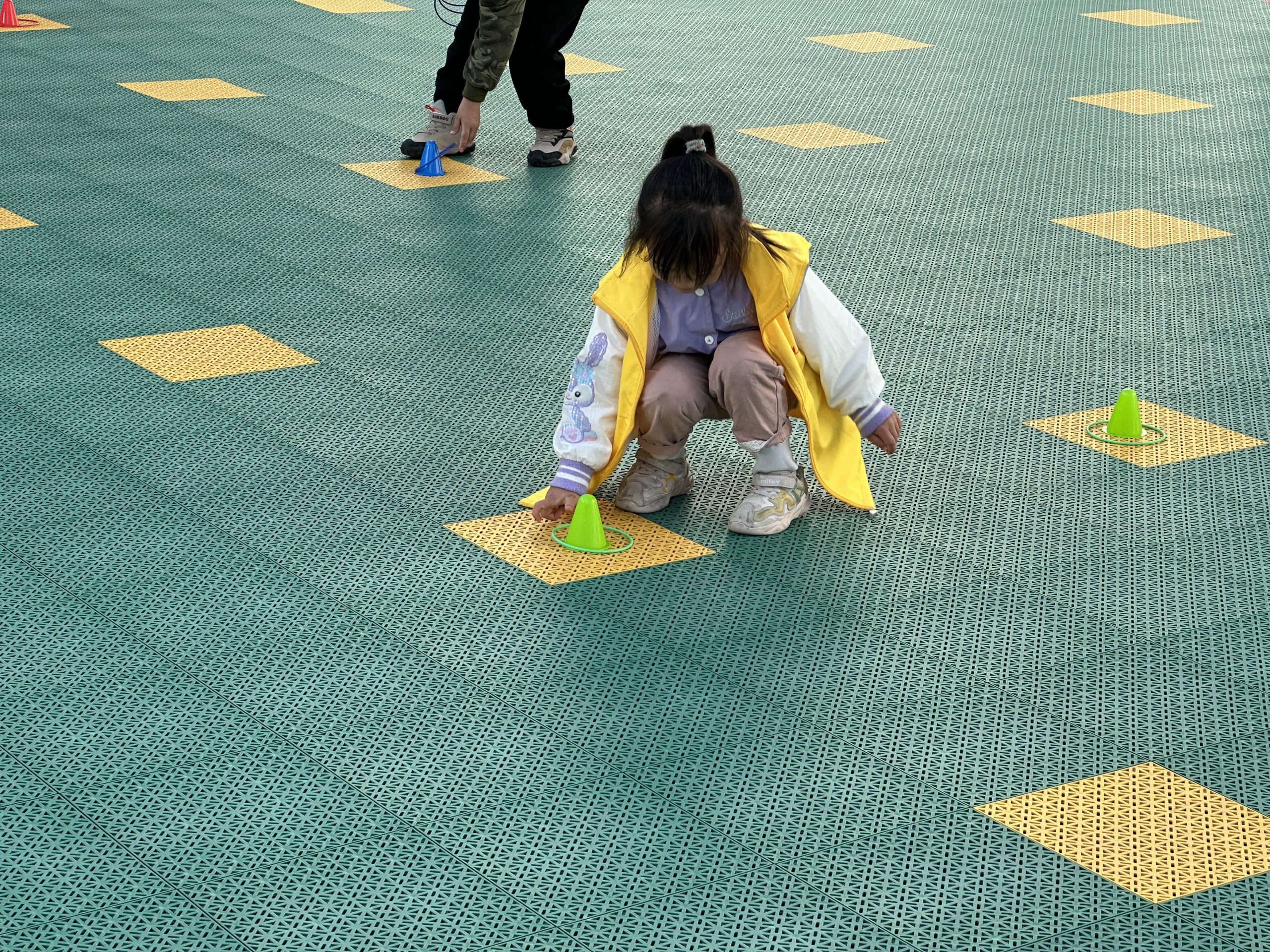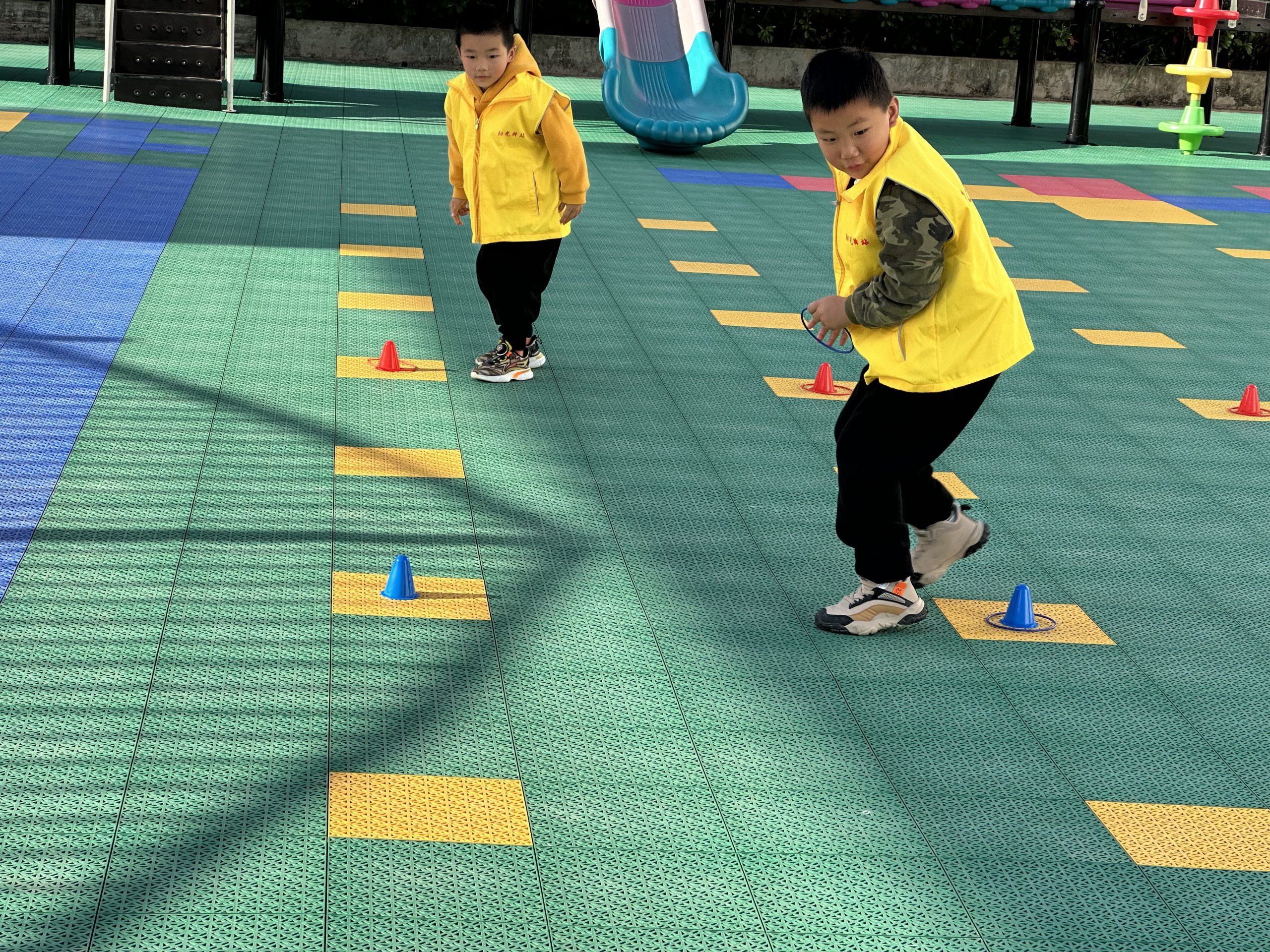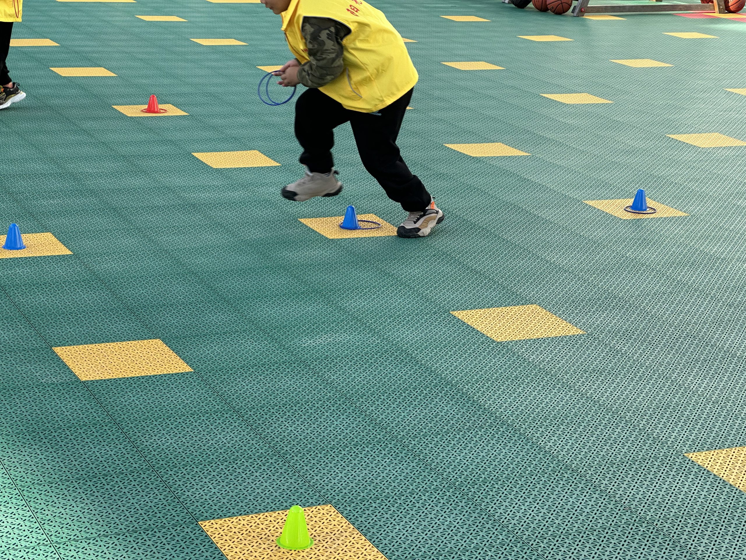 在活动“蚂蚁搬家”中,小朋友们积极参与,奋勇争前,顺利的把圆圈套在了全部路障上。