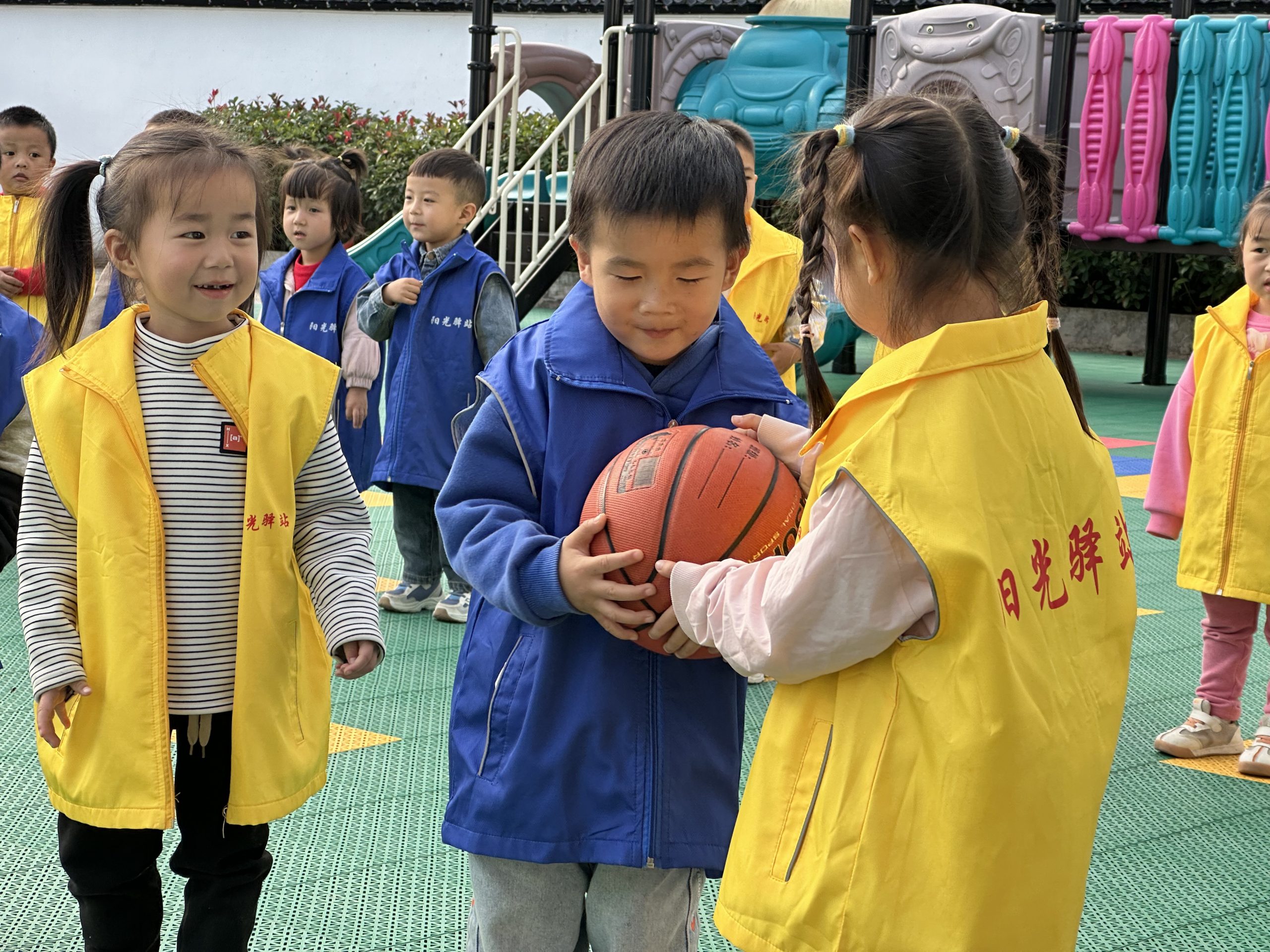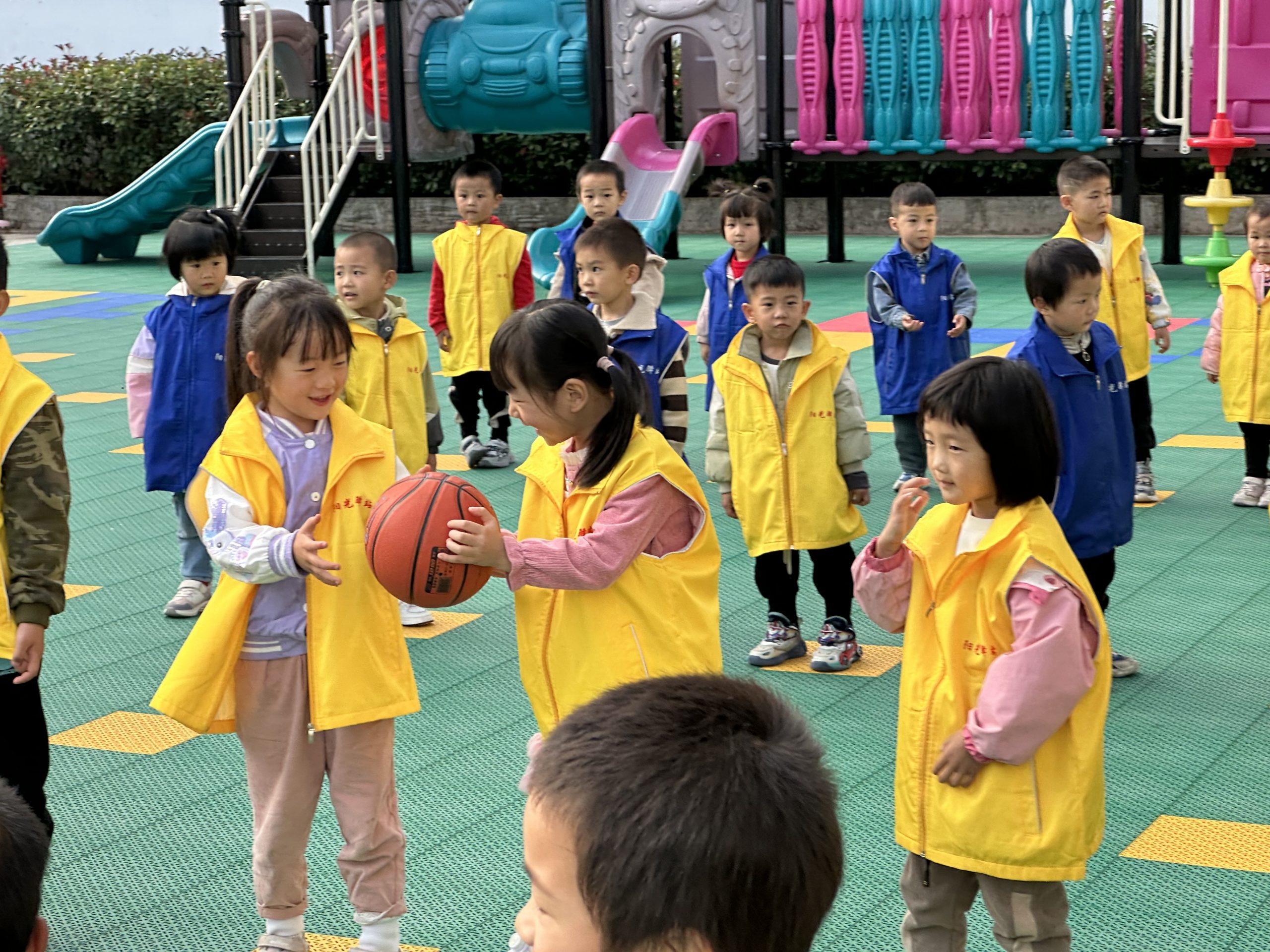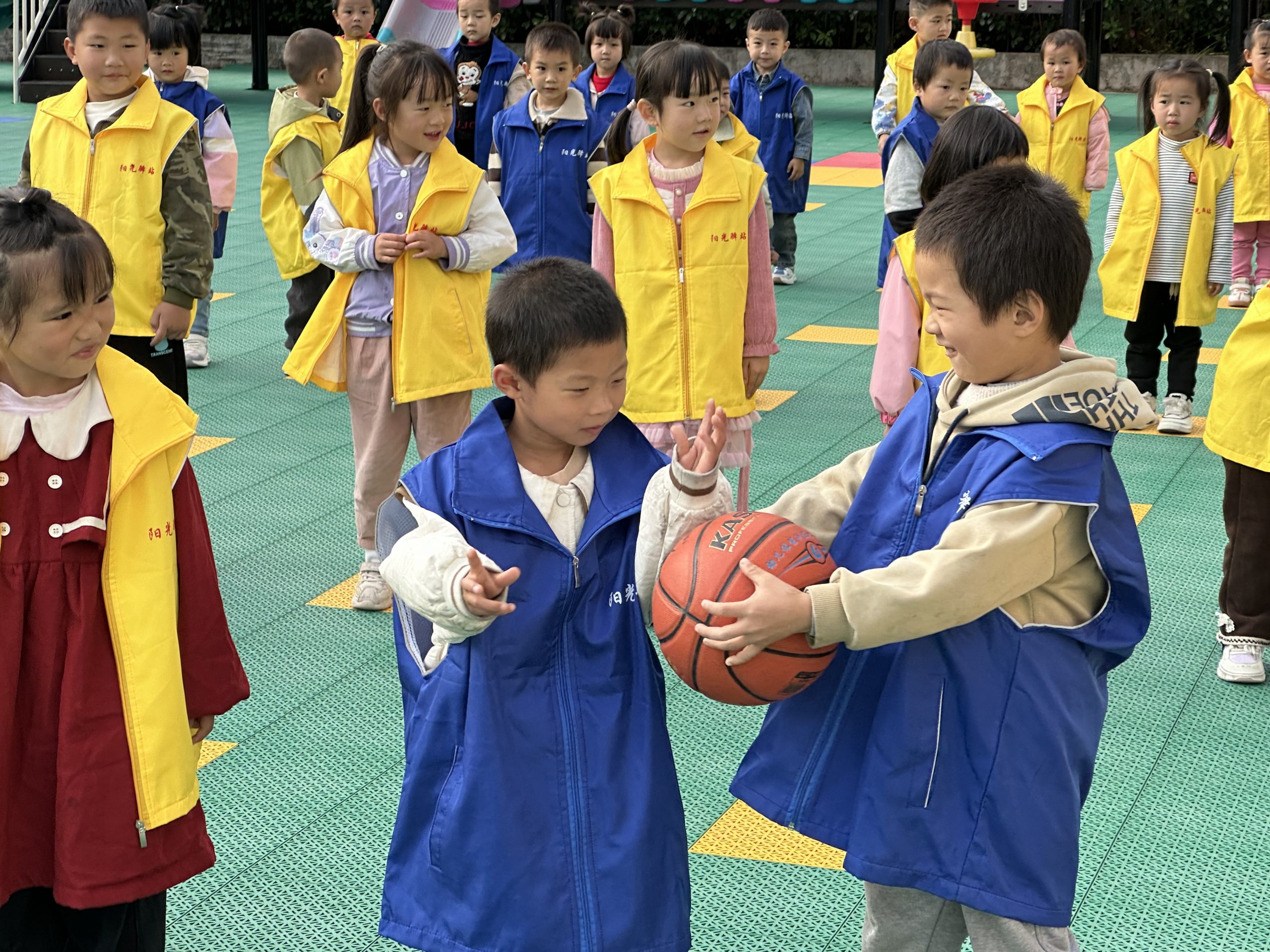 “亲密传递”环节,分成四个大组,需要把篮球从第一个人逐一传至最后一个人,小朋友们全身心投入,共同完成游戏任务,并分享成功的喜悦。