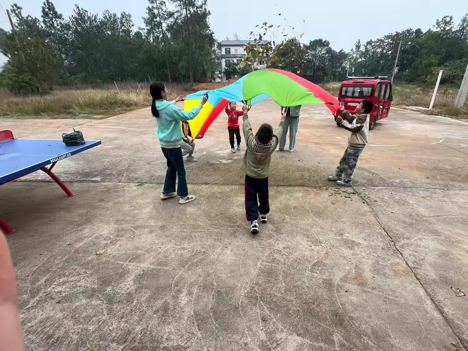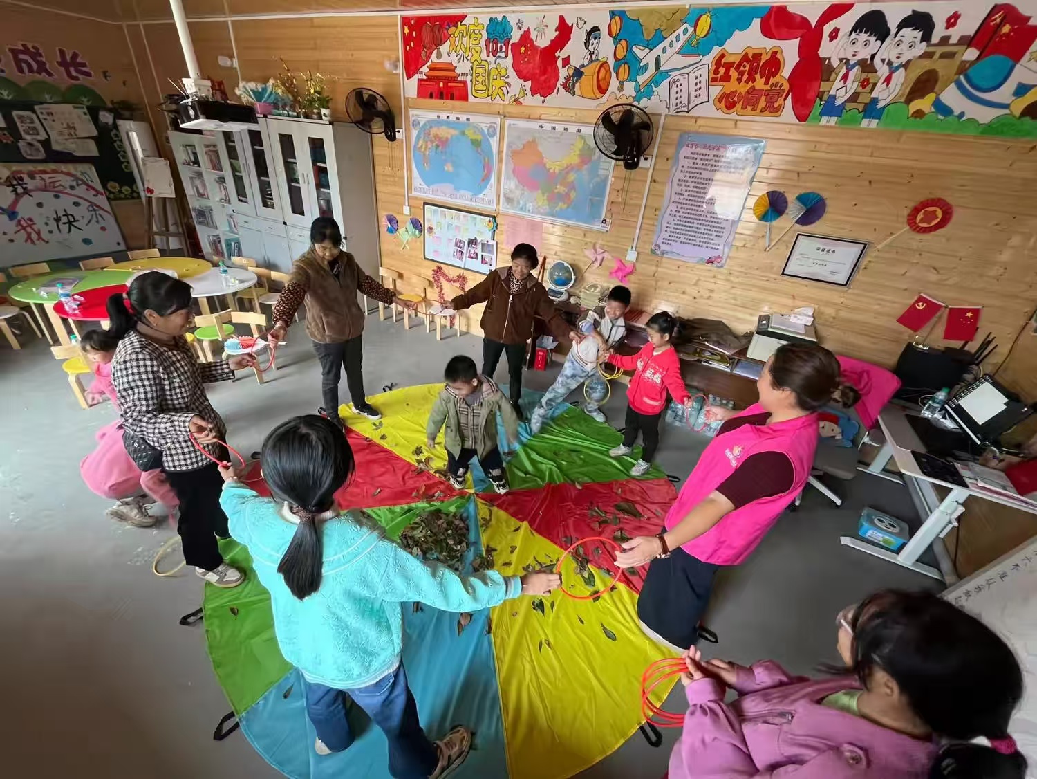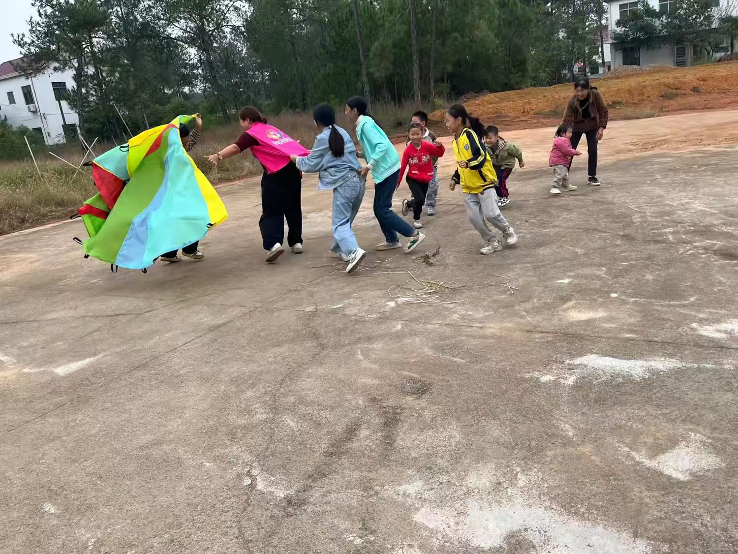 在一片开阔的空地上,一场激动人心的老鹰抓小鸡游戏正在上演。志愿者和孩子们兴奋地聚集在一起,操纵着巨大的彩虹伞,这个活动不仅让孩子们体会到了需要团结,更激发了他们对未知世界的无限憧憬。