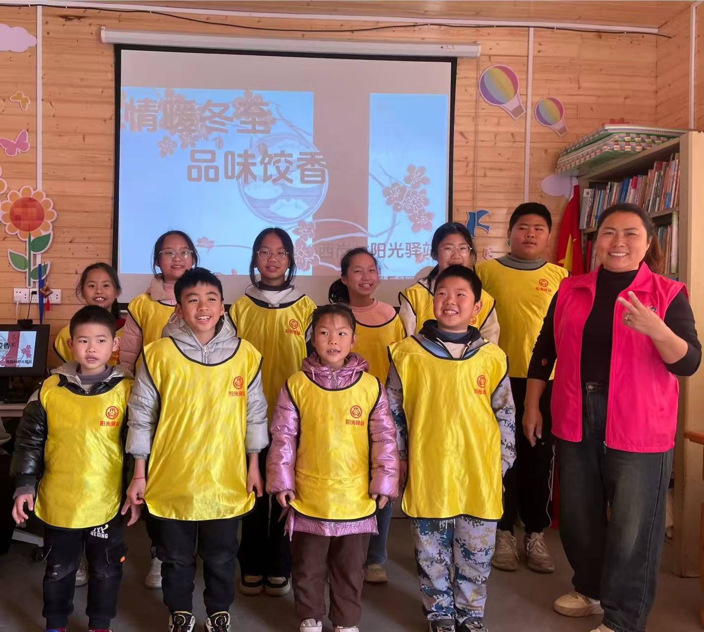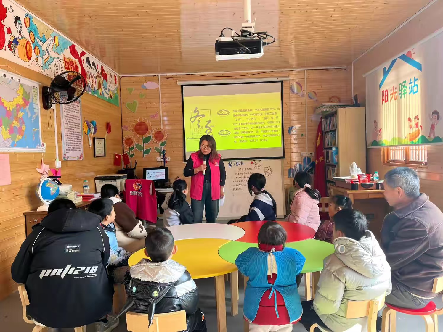 驿站内的知识分享:在阳光驿站内,孩子们围坐在一起,聚精会神地听着志愿者讲述冬至的来历和饺子的历史。