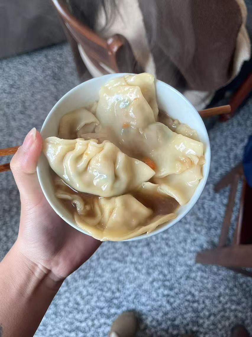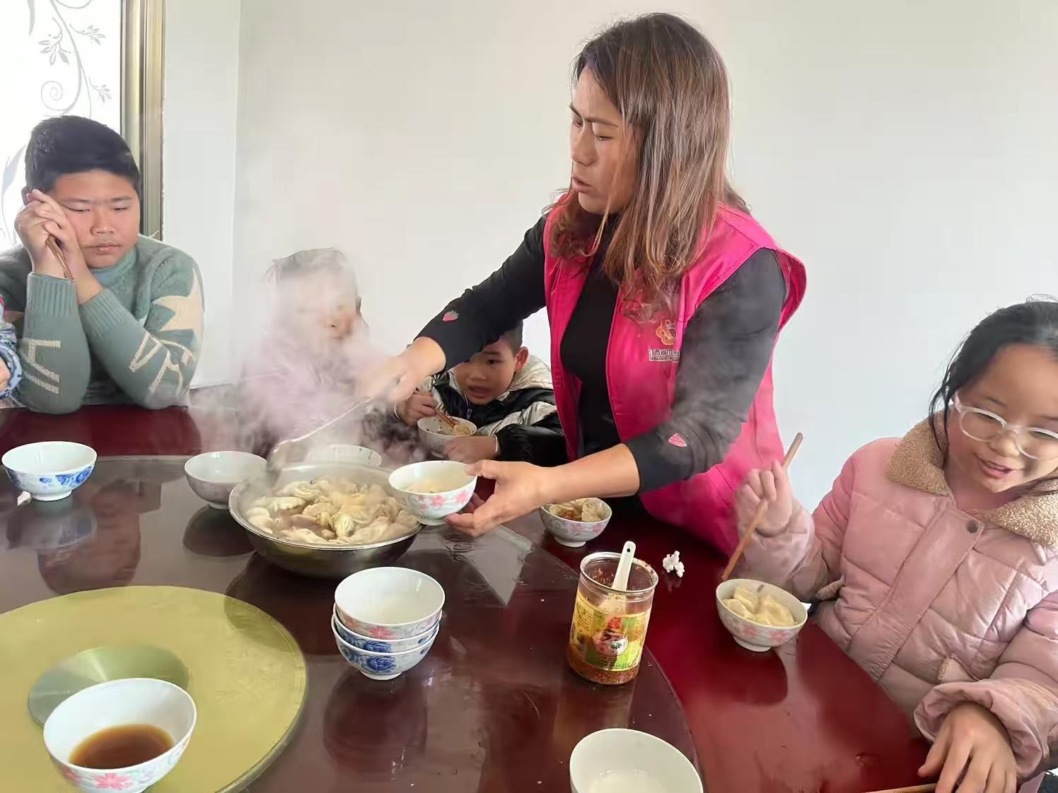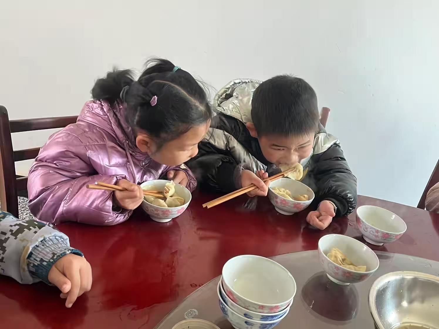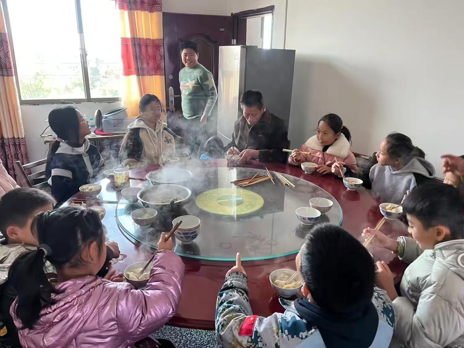 最后品尝:最后大家围坐在一张大圆桌旁,享受着亲手制作的饺子。孩子们兴奋地用筷子夹取食物,脸上洋溢着满足的笑容。