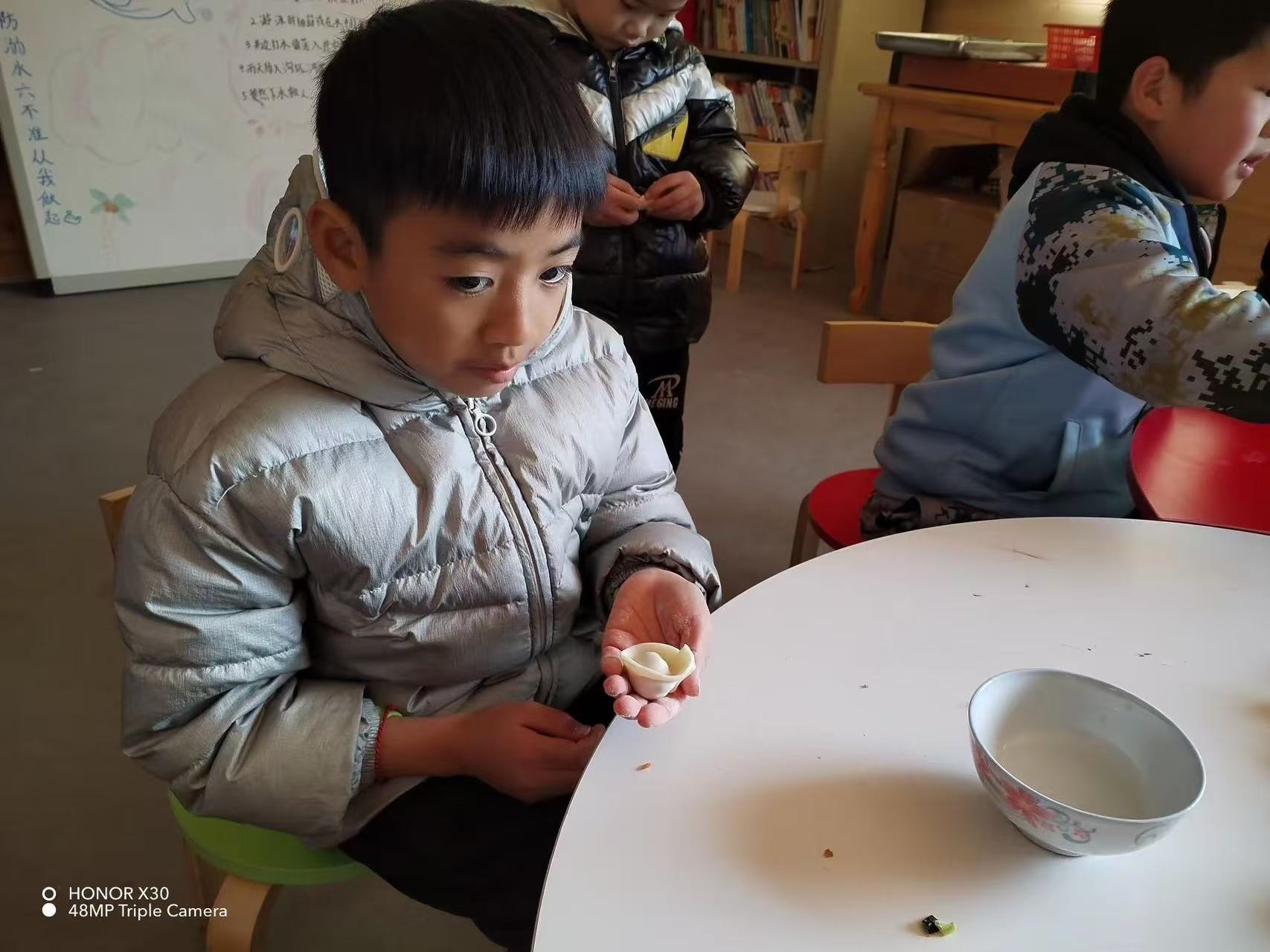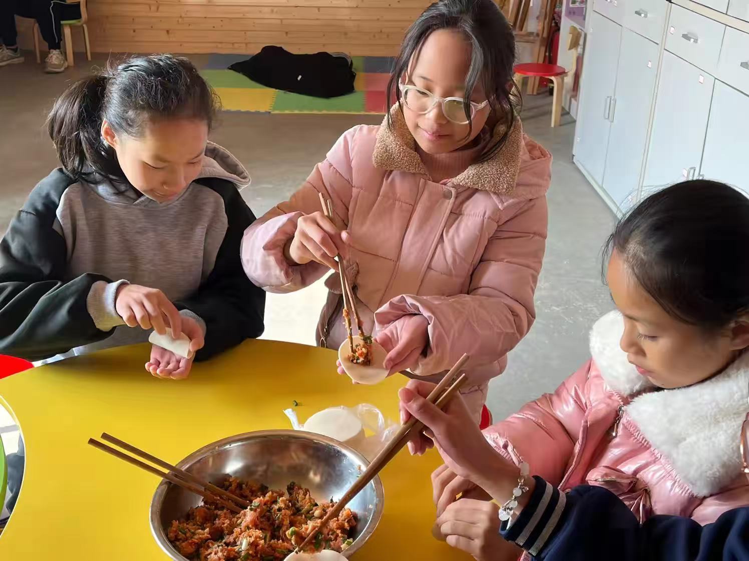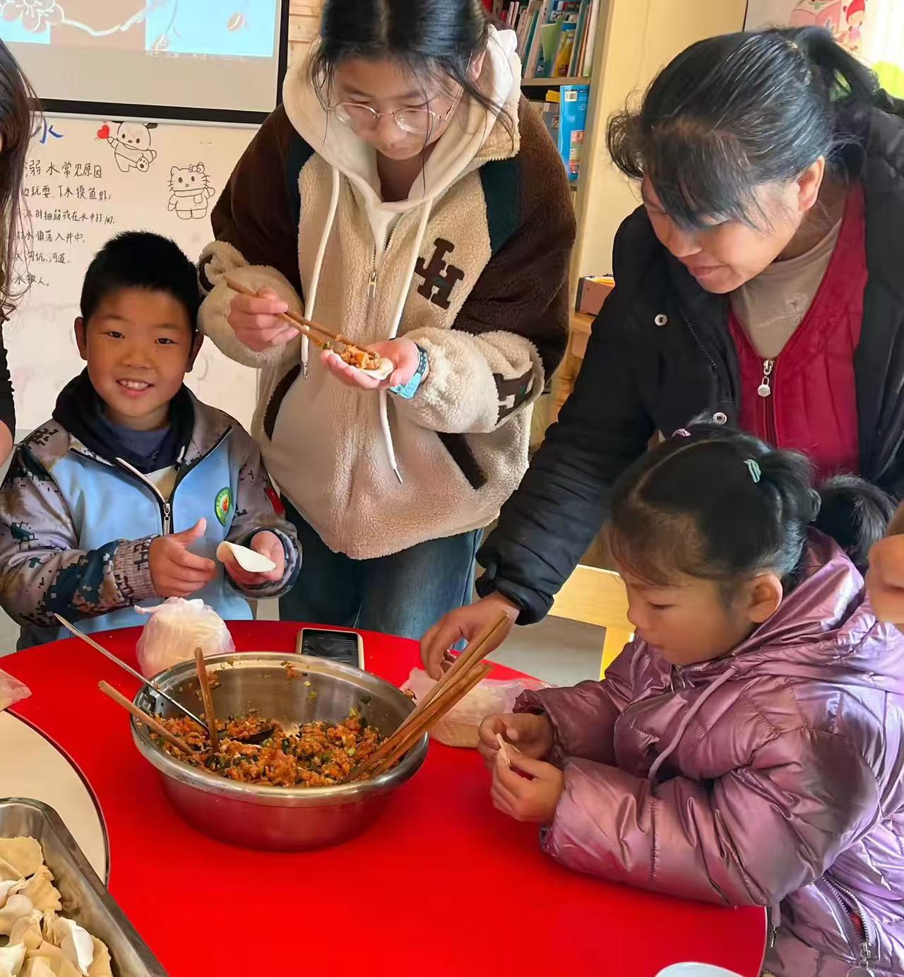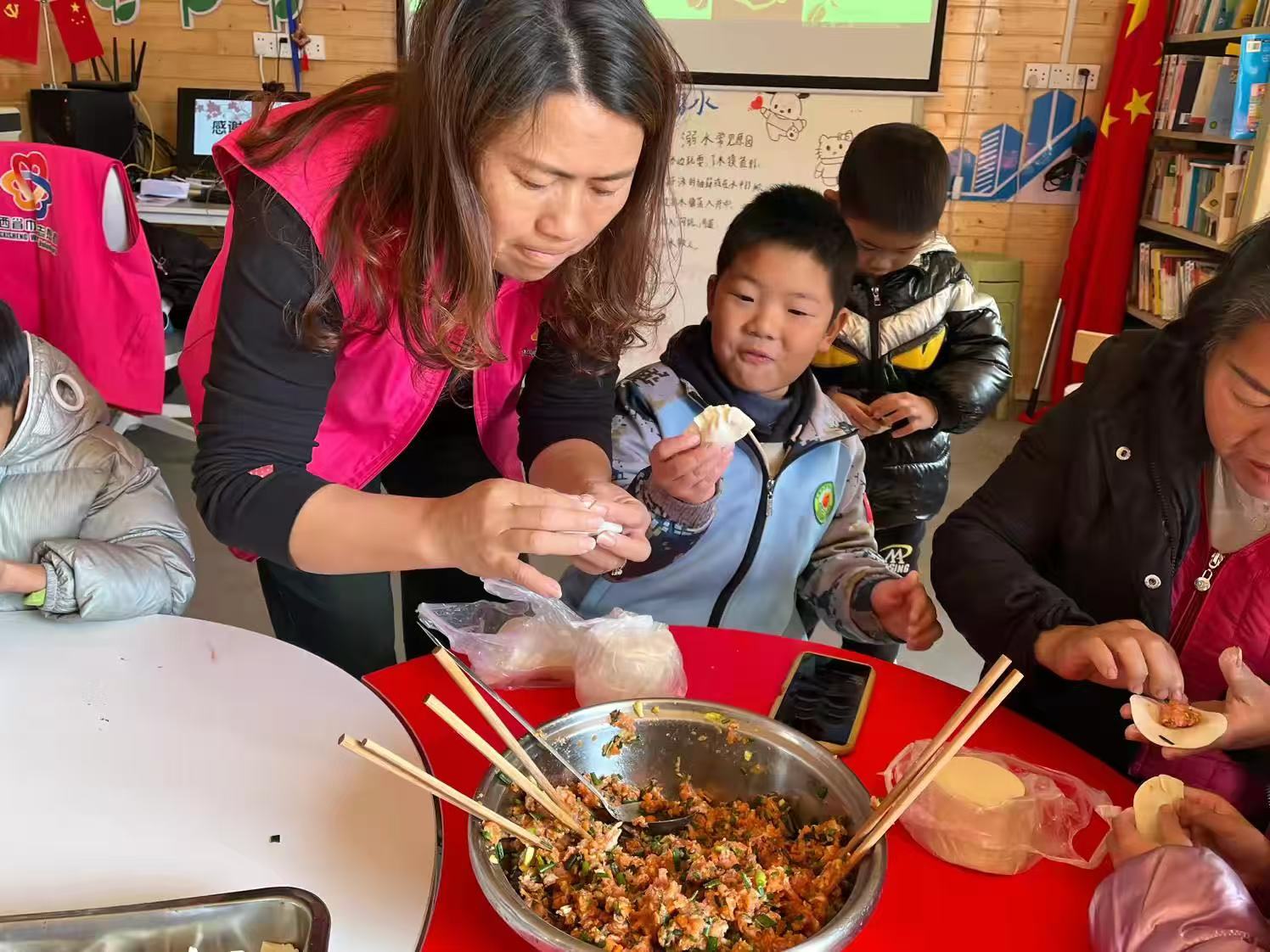 志愿者正耐心地指导孩子们如何包饺子。她一边示范,一边解释每一步骤的要点,孩子们则兴致勃勃地跟着学习。无论是初次尝试还是已经熟练,每个人都在这个过程中找到了乐趣。