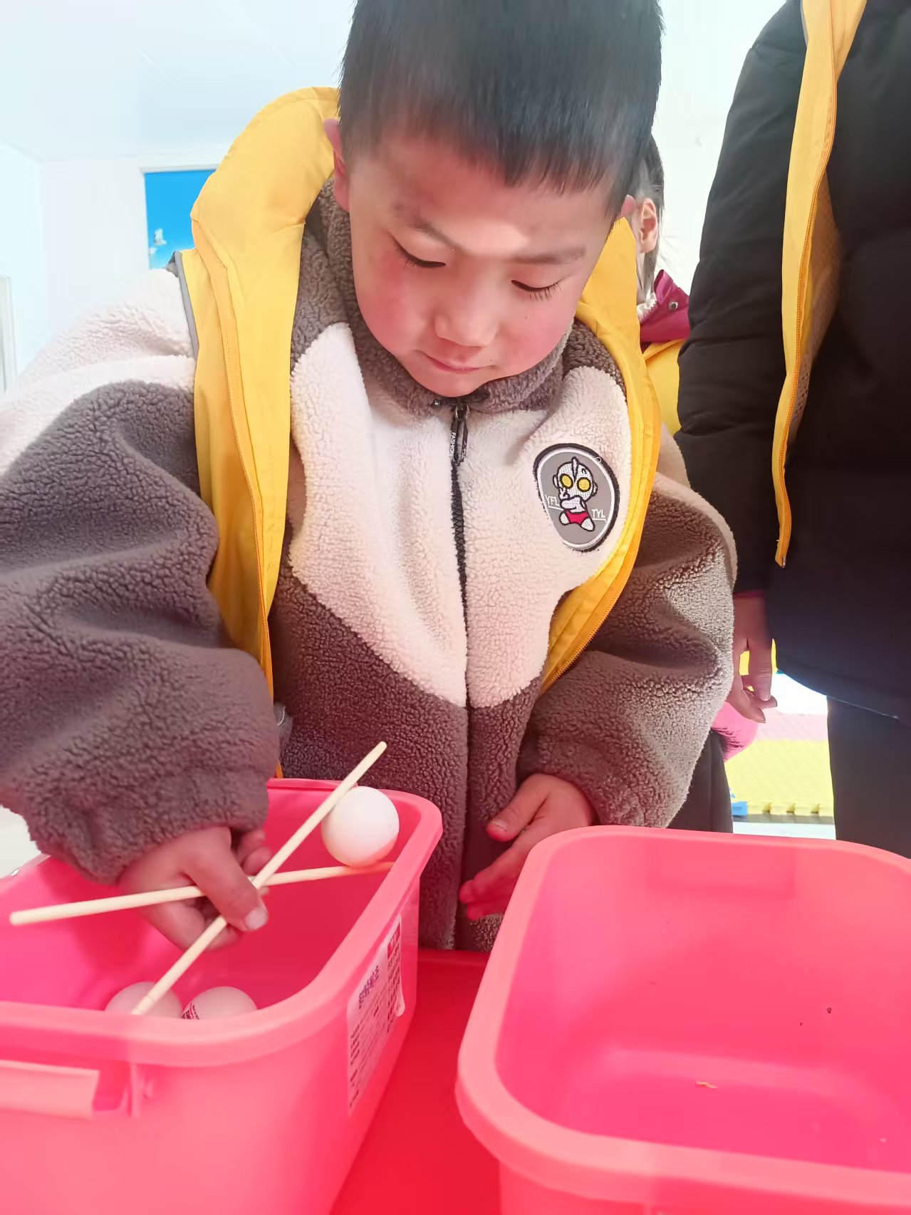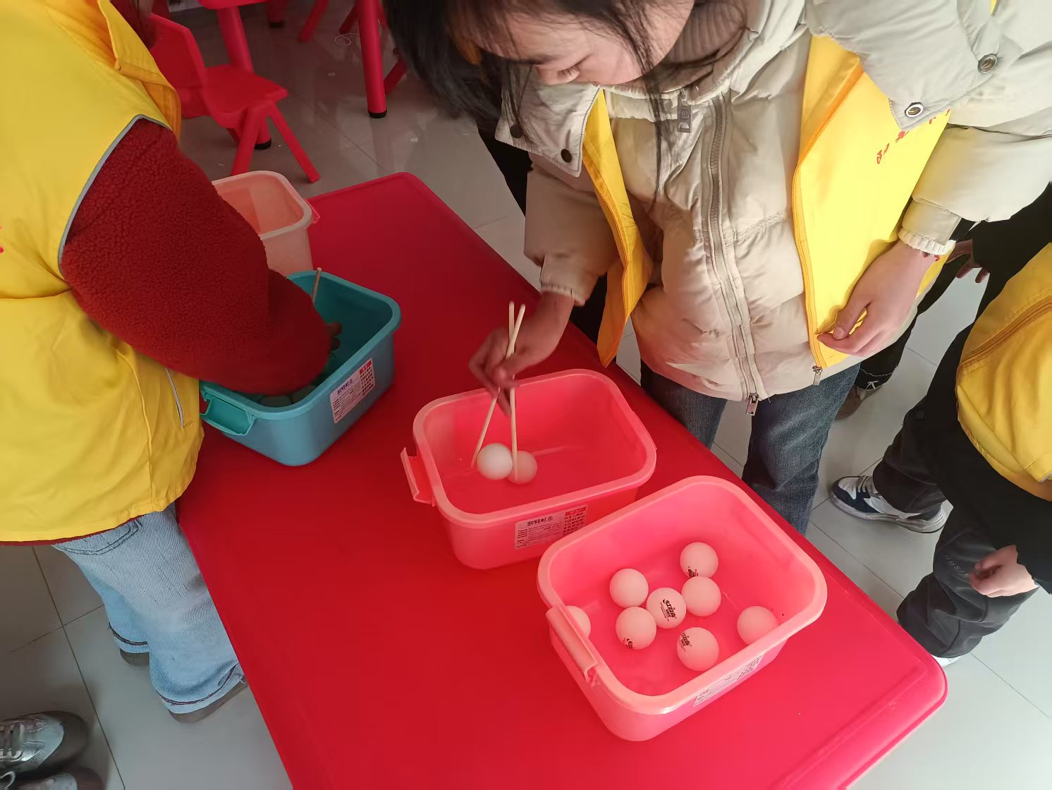 在筷子夹乒乓球游戏中,孩子们更是展现出了非凡的协调能力和反应速度。他们手持筷子,小心翼翼地夹起乒乓球,然后稳稳地放入指定的容器中。这个游戏不仅锻炼了孩子们的手眼协调能力,还让他们在游戏中体验到了成功的喜悦。