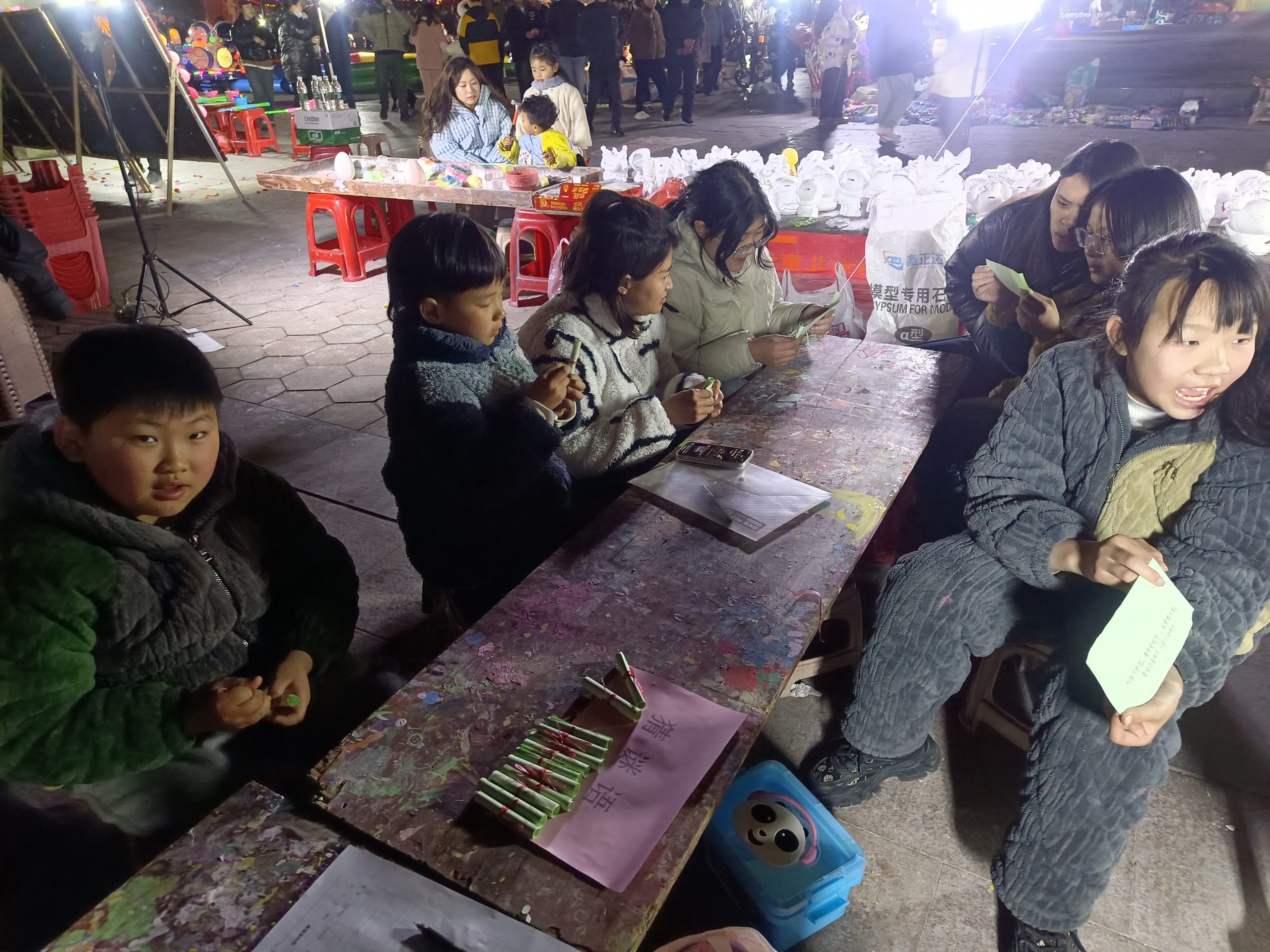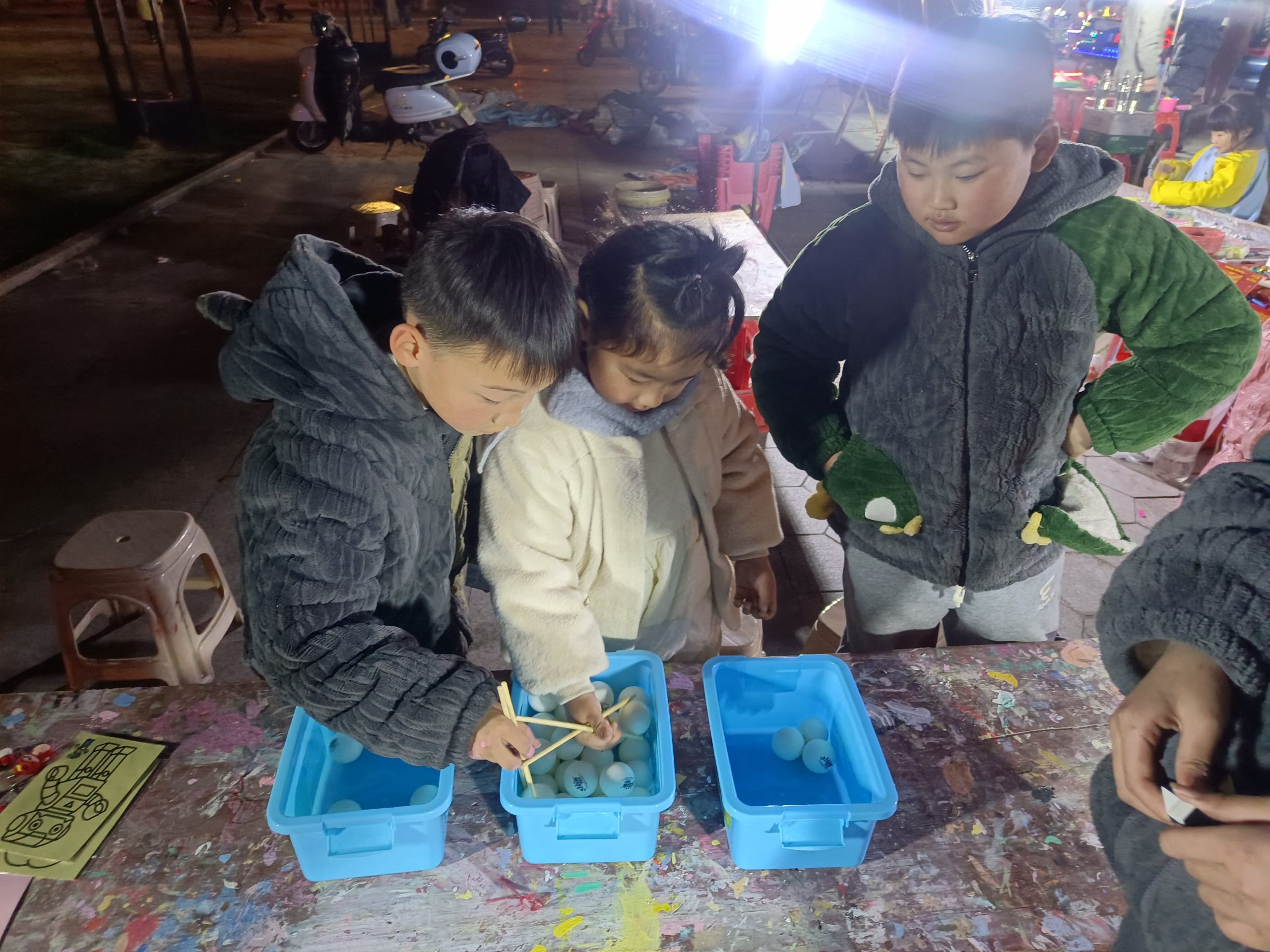 孩子们在夜市里体验夹“元宵”、猜灯谜、涂鸦等活动,充分体验元宵节夜市的热闹景象。