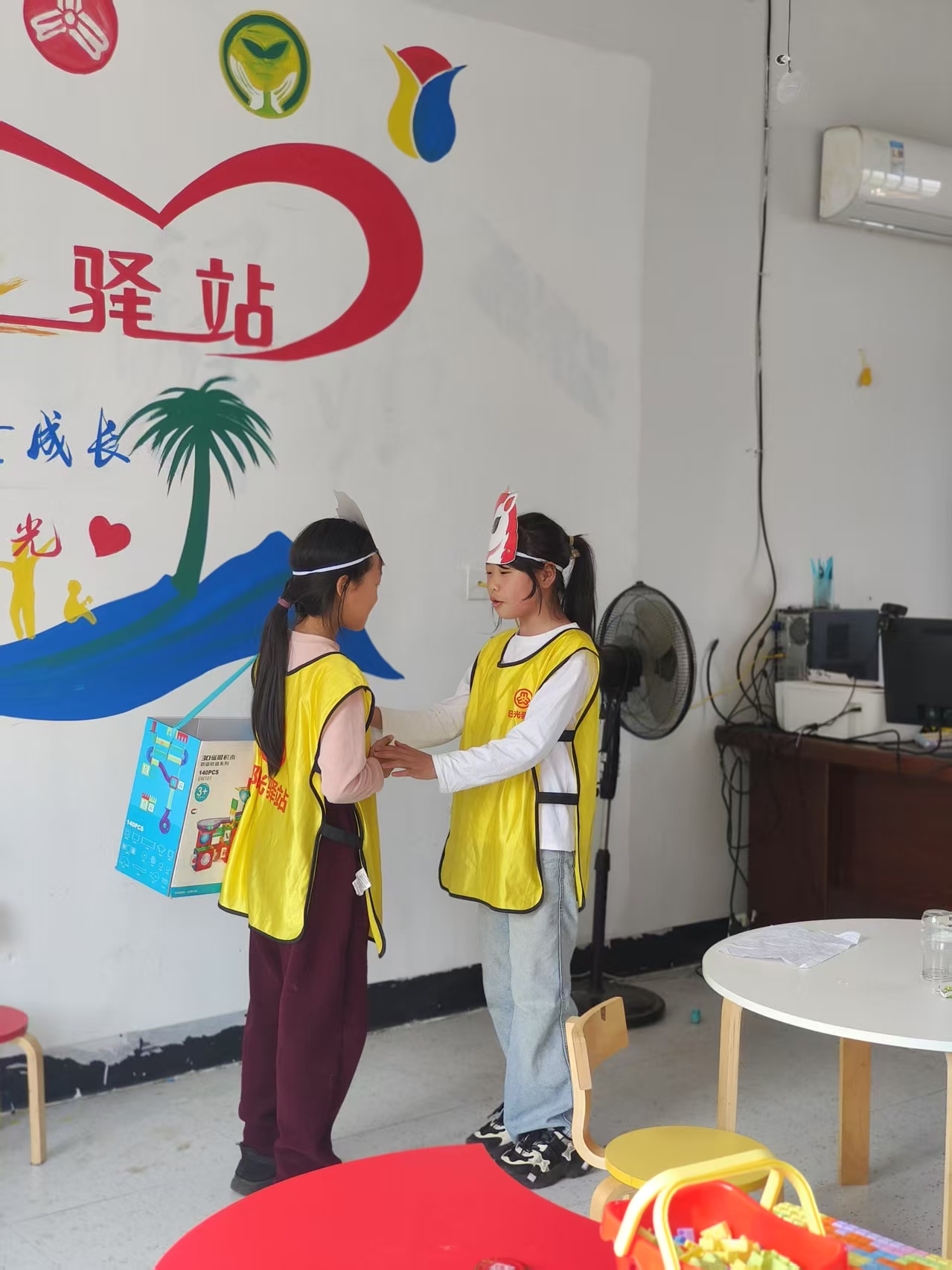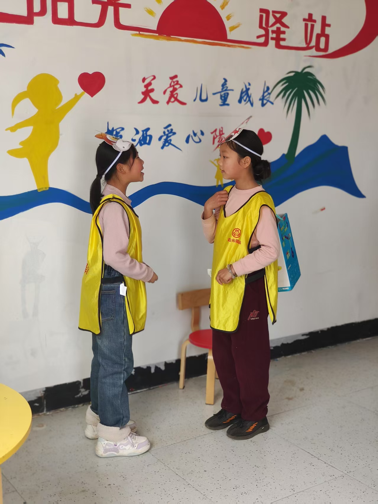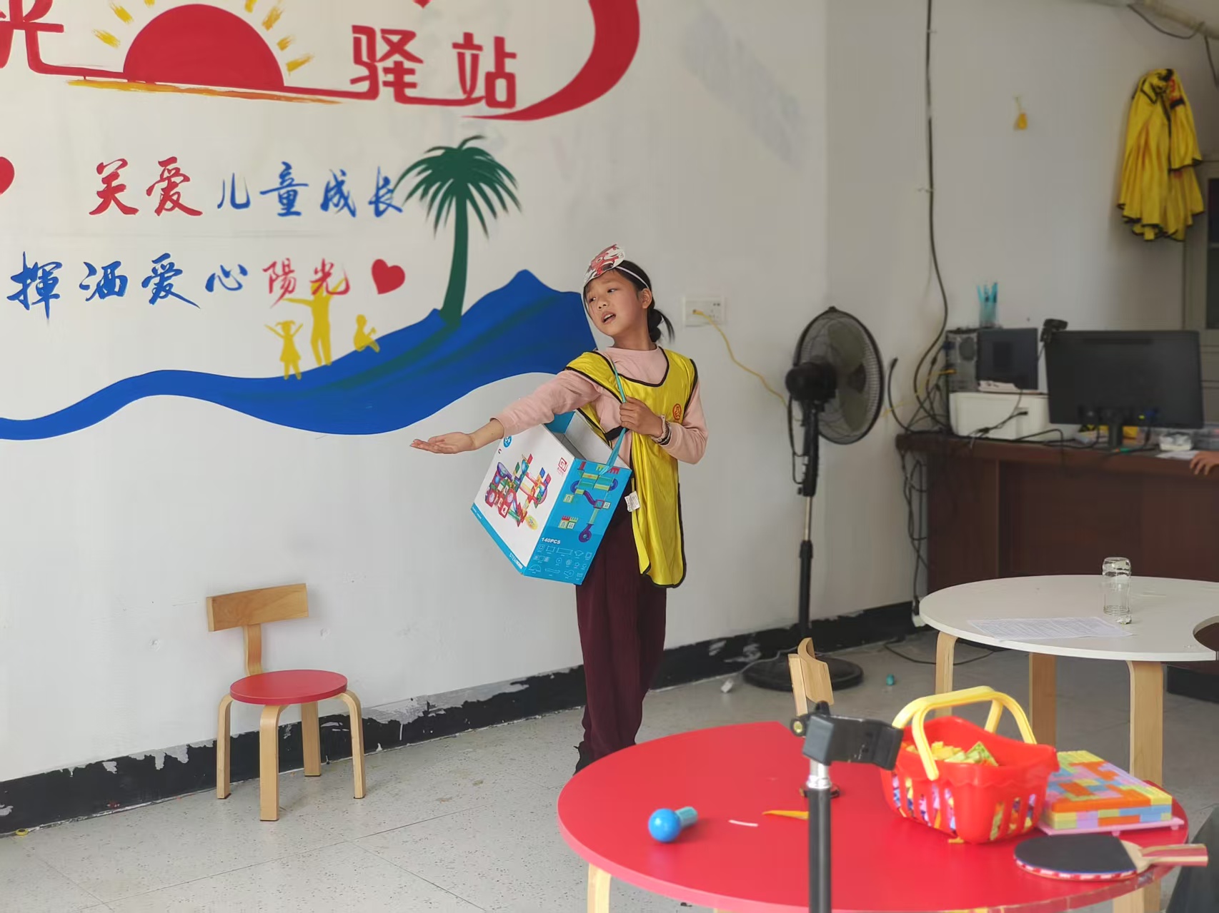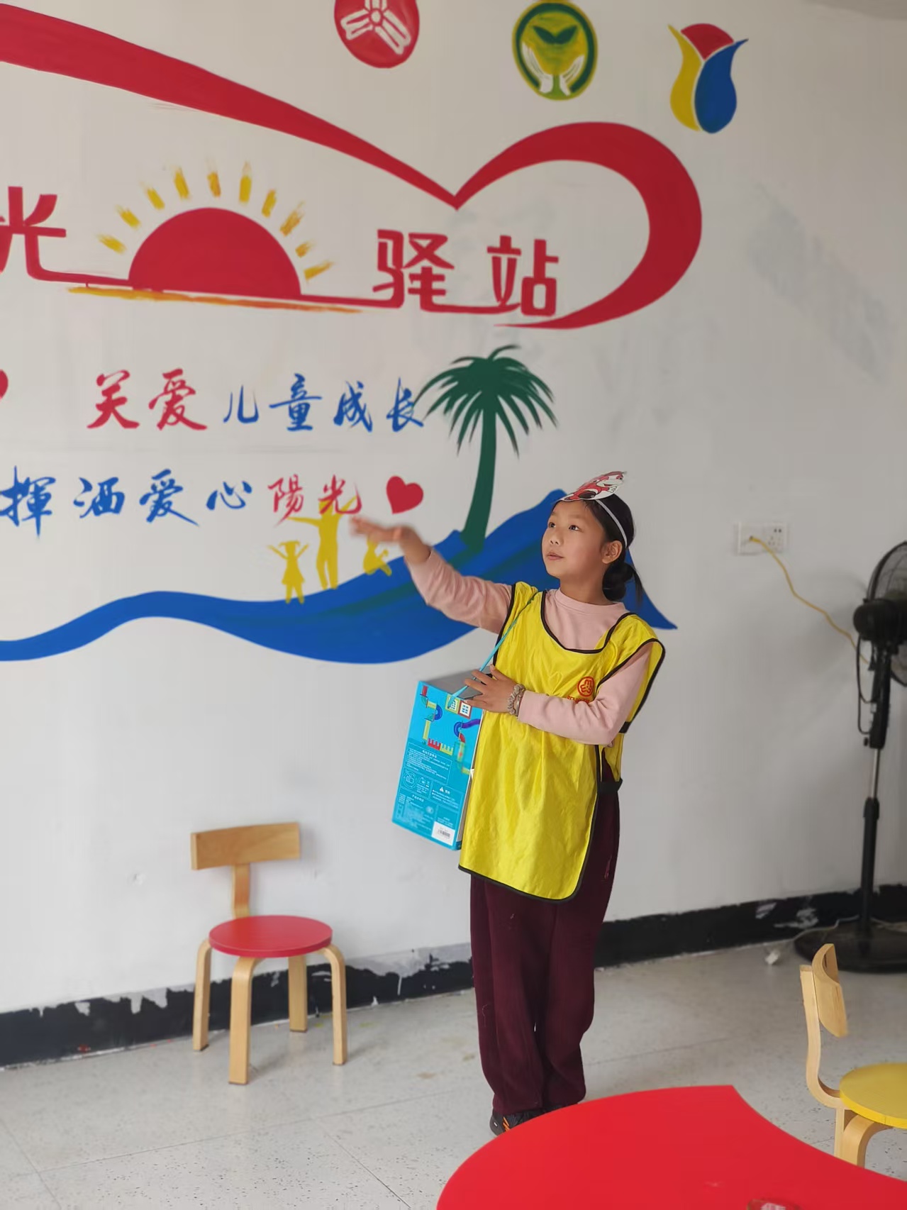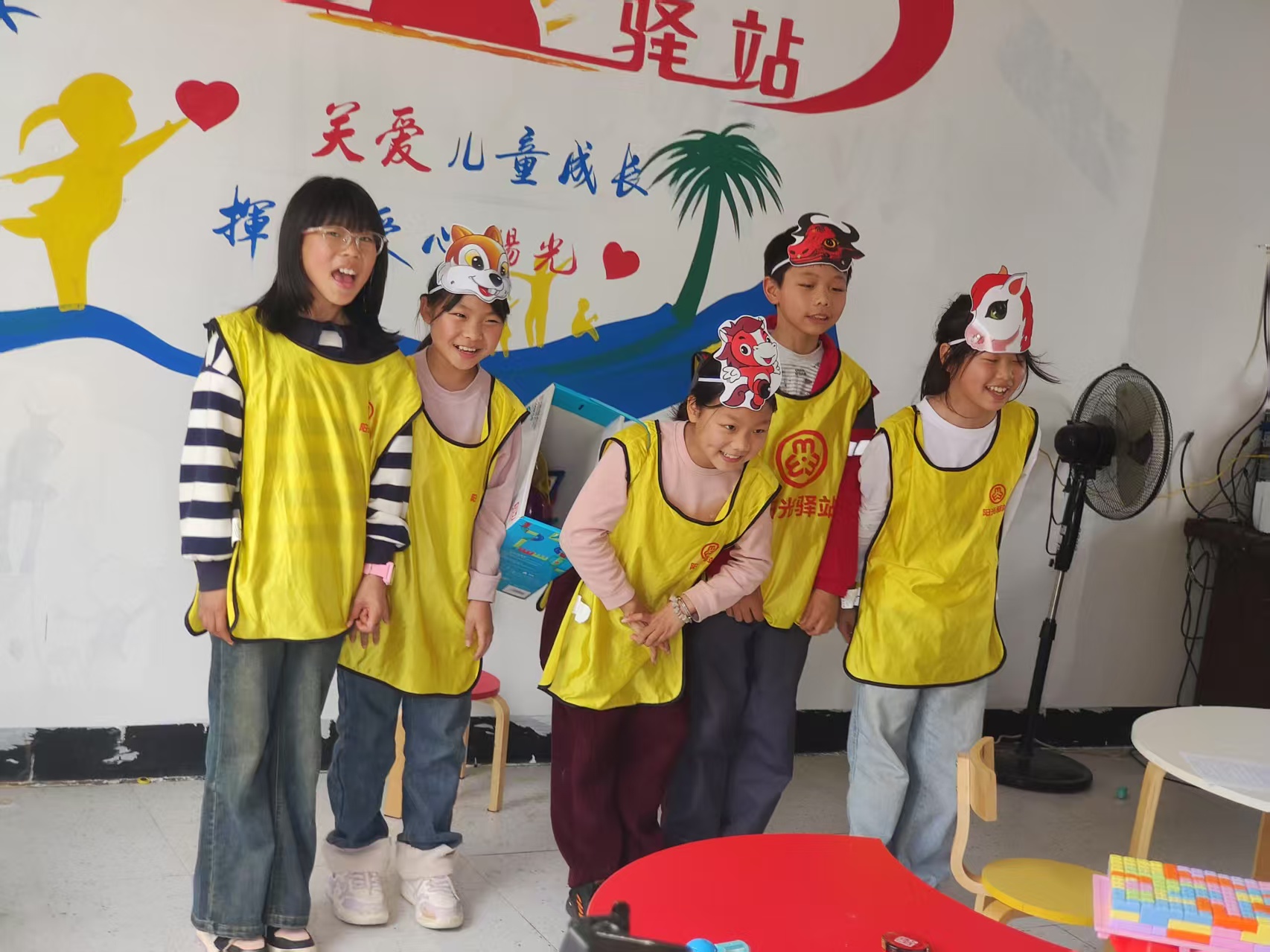 紧接着,活动进入高潮环节。一名勇敢的小志愿者站了出来,带领大家朗读经典童话故事《小马过河》。随着故事的展开,志愿者巧妙地提出问题:“文中都有哪些角色呢?你们愿意扮演谁?”孩子们的热情被瞬间点燃,纷纷举手报名。于是,志愿者们为孩子们分发了象征身份的老牛、老马、小马和松鼠面具,孩子们兴奋不已,迫不及待地准备开始角色扮演。