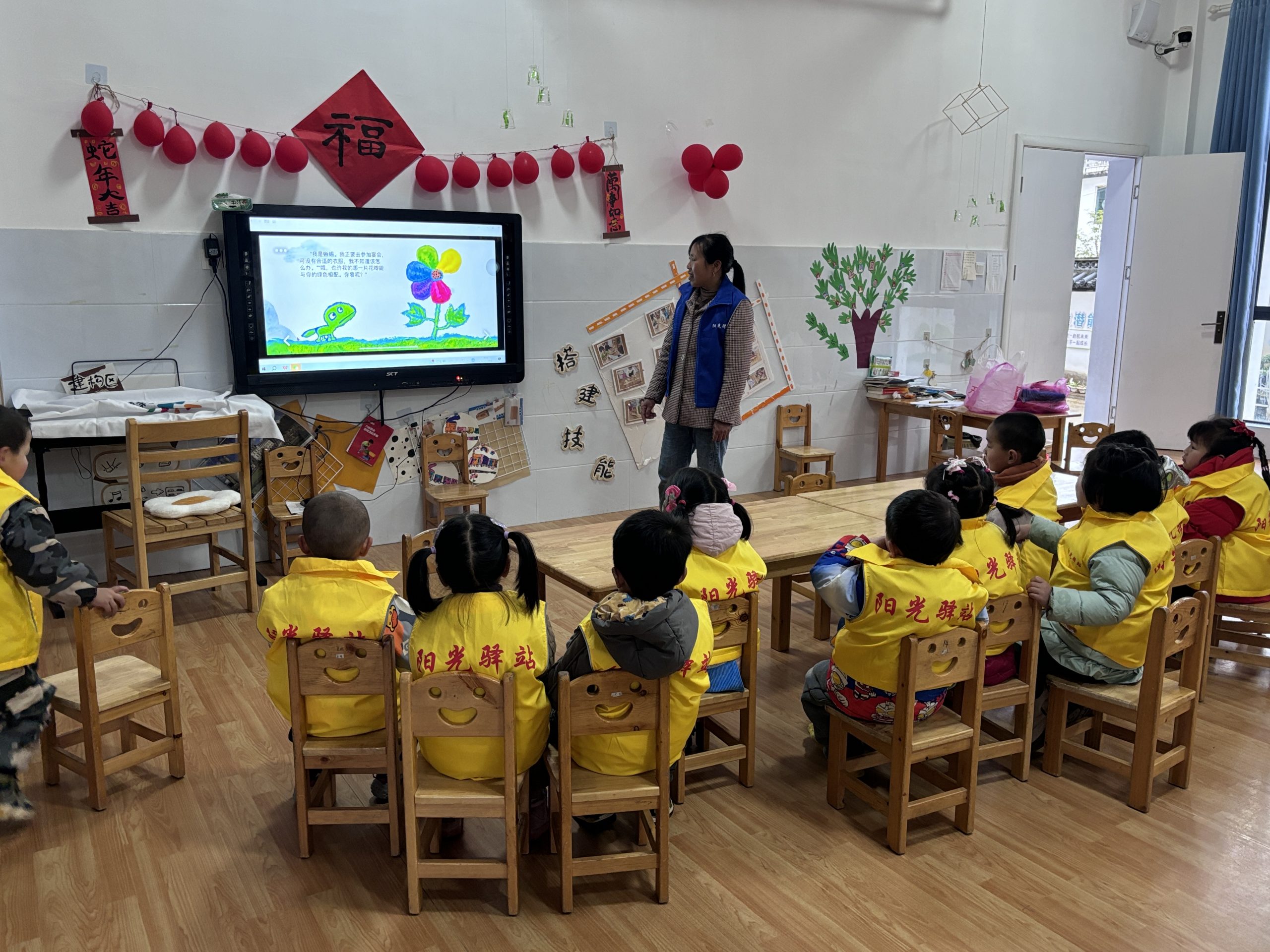 工作人员向孩子们讲述绘本《彩虹色的花》