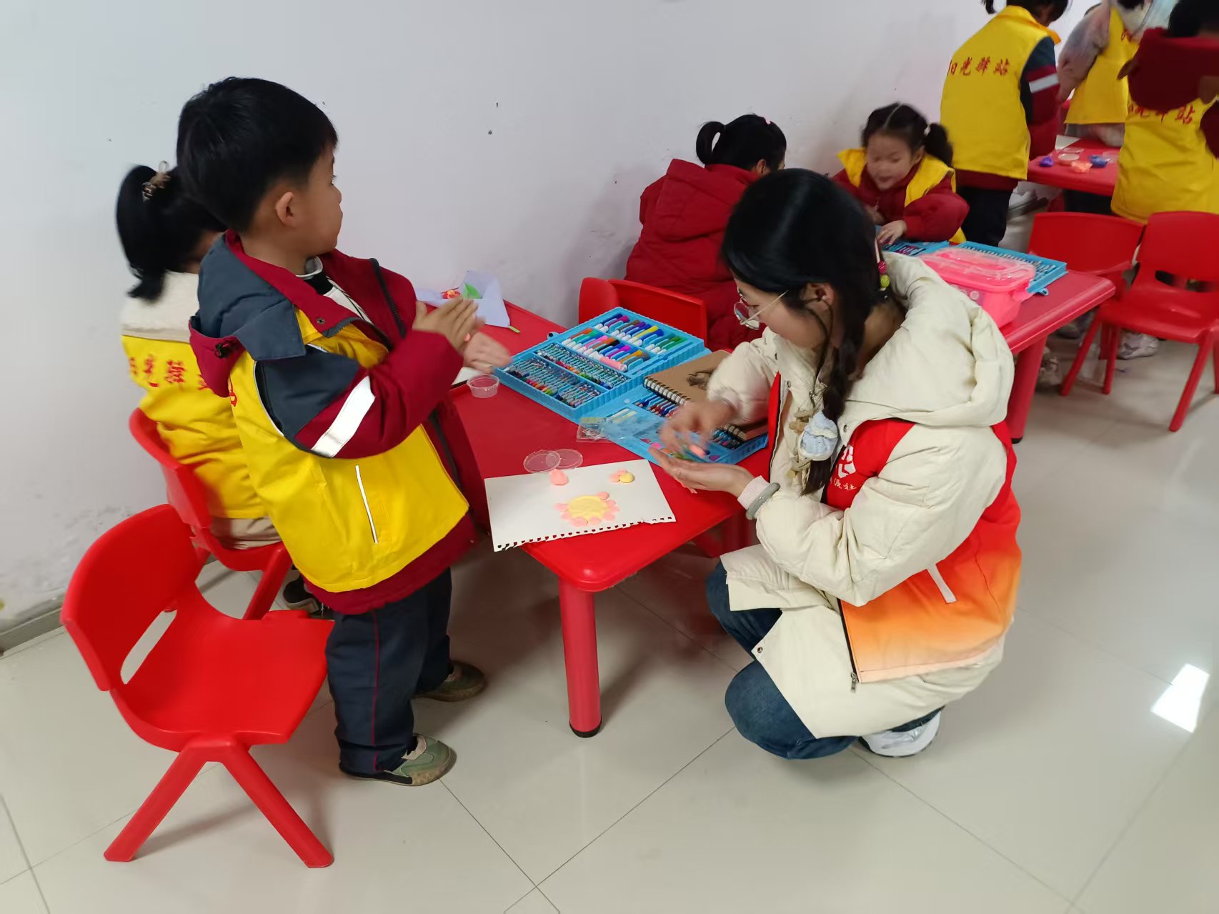 活动的重头戏是孩子们的手工制作环节。在志愿者老师的指导下,孩子们纷纷拿起五颜六色的橡皮泥,开始动手制作鲜花。他们的小手虽然稚嫩,但却充满了创意和热情。不一会儿,一朵朵栩栩如生的橡皮泥鲜花就在孩子们的手中绽放开来。这些鲜花不仅代表着孩子们对妈妈的爱和祝福,更是他们心灵手巧的见证。