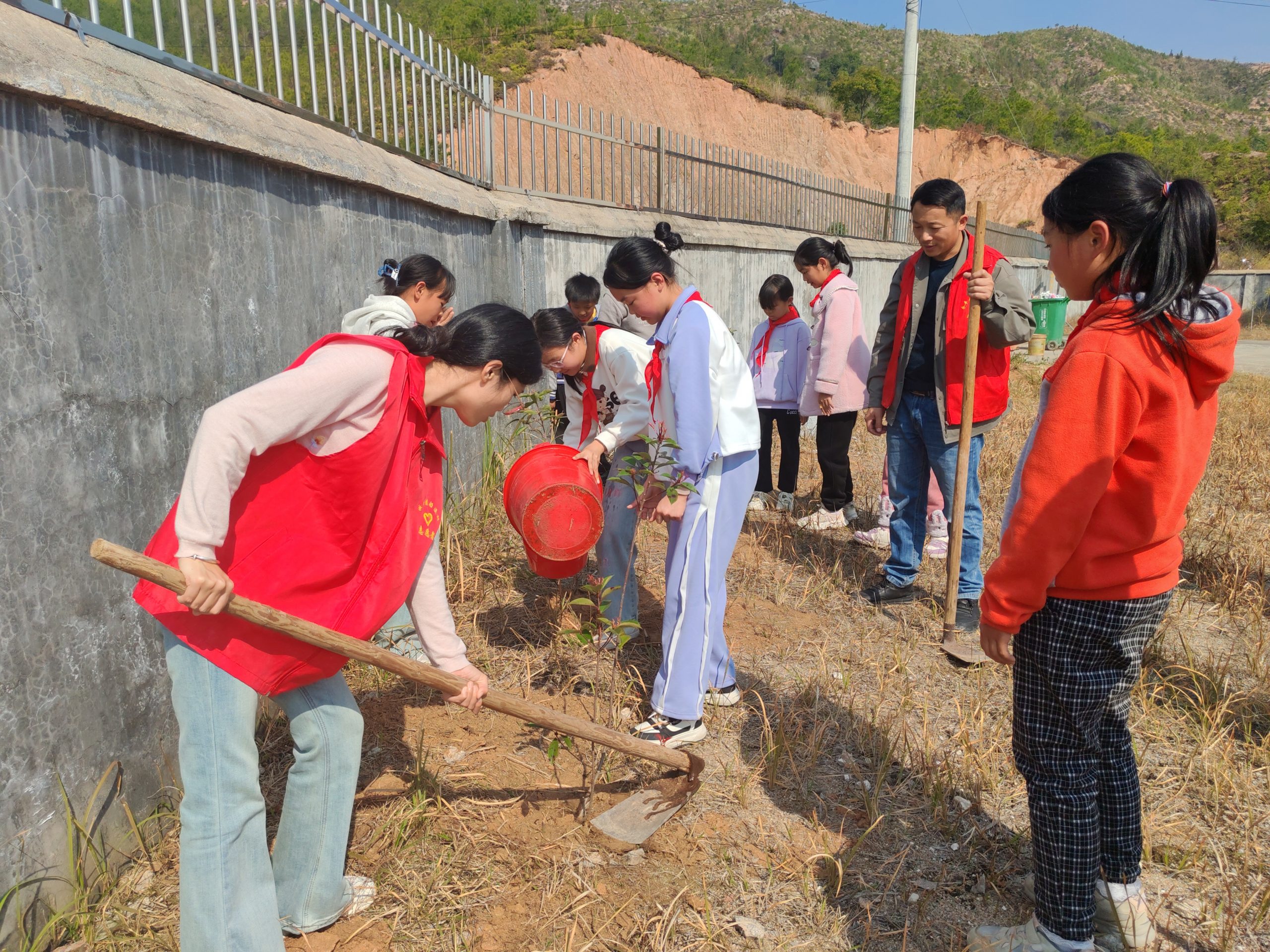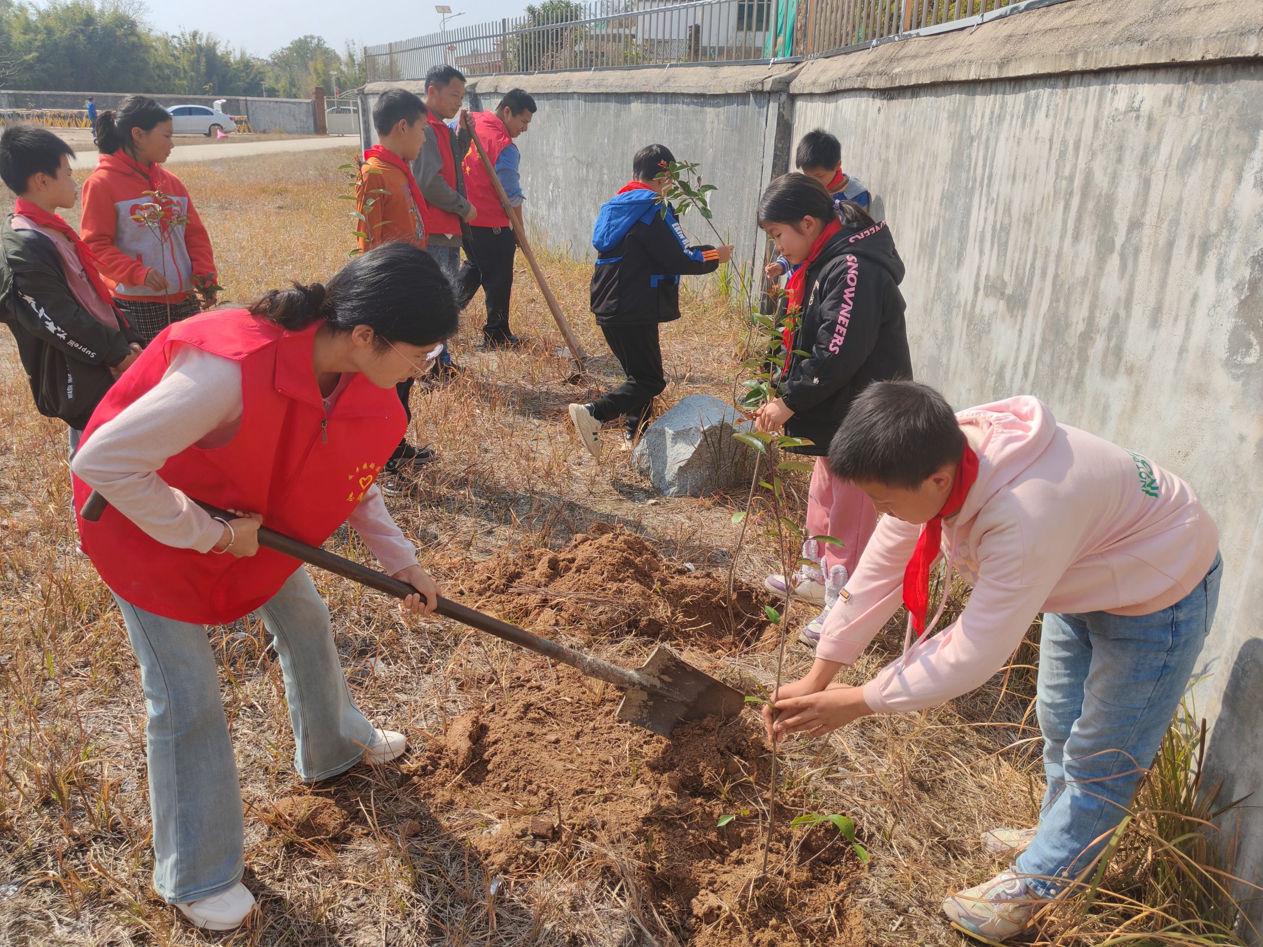 志愿者与学生默契配合,挖坑、扶苗、填土、浇水、夯土,一株株新栽的树苗昂然挺立,在春日的阳光下展现出勃勃生机,为初春的大地增添了丝丝春意。