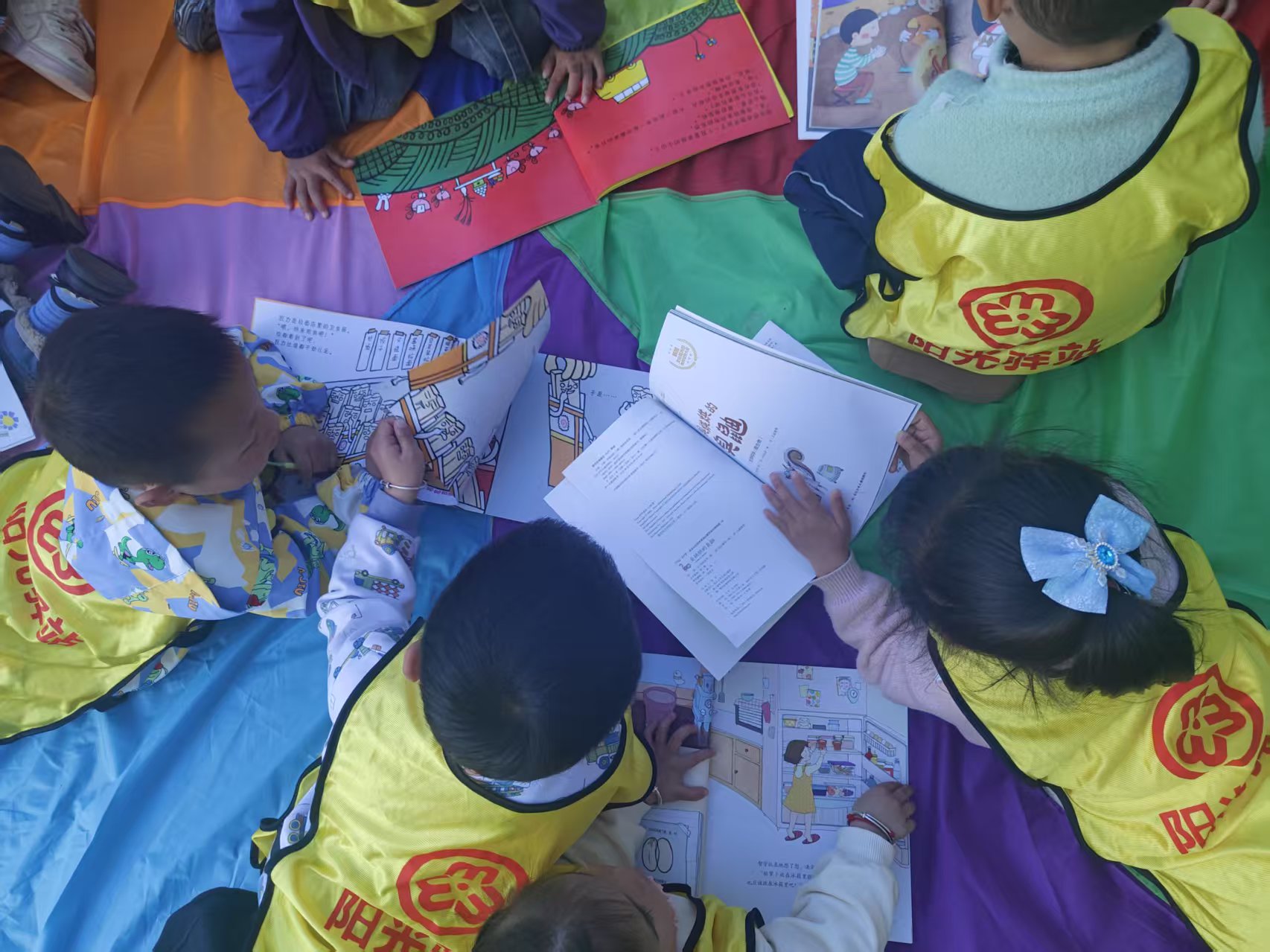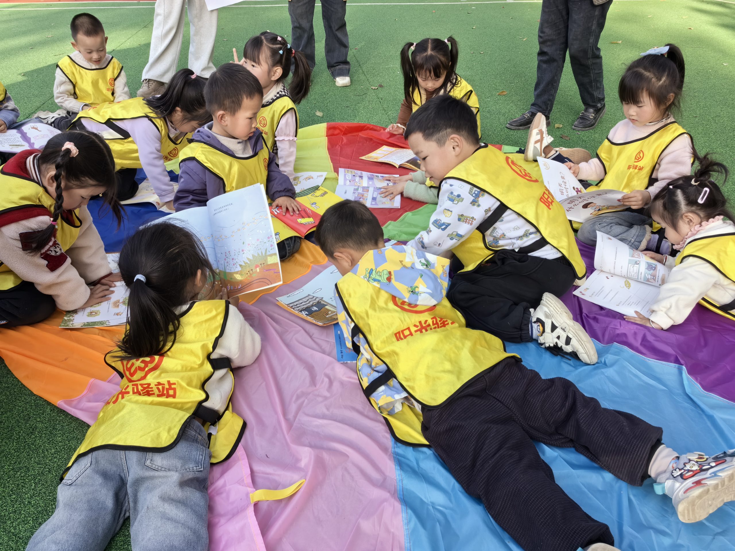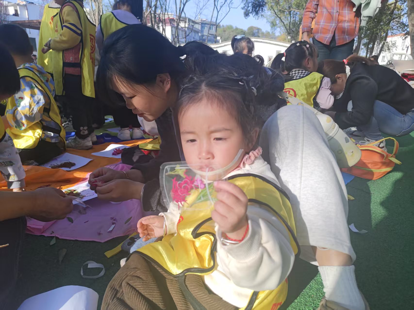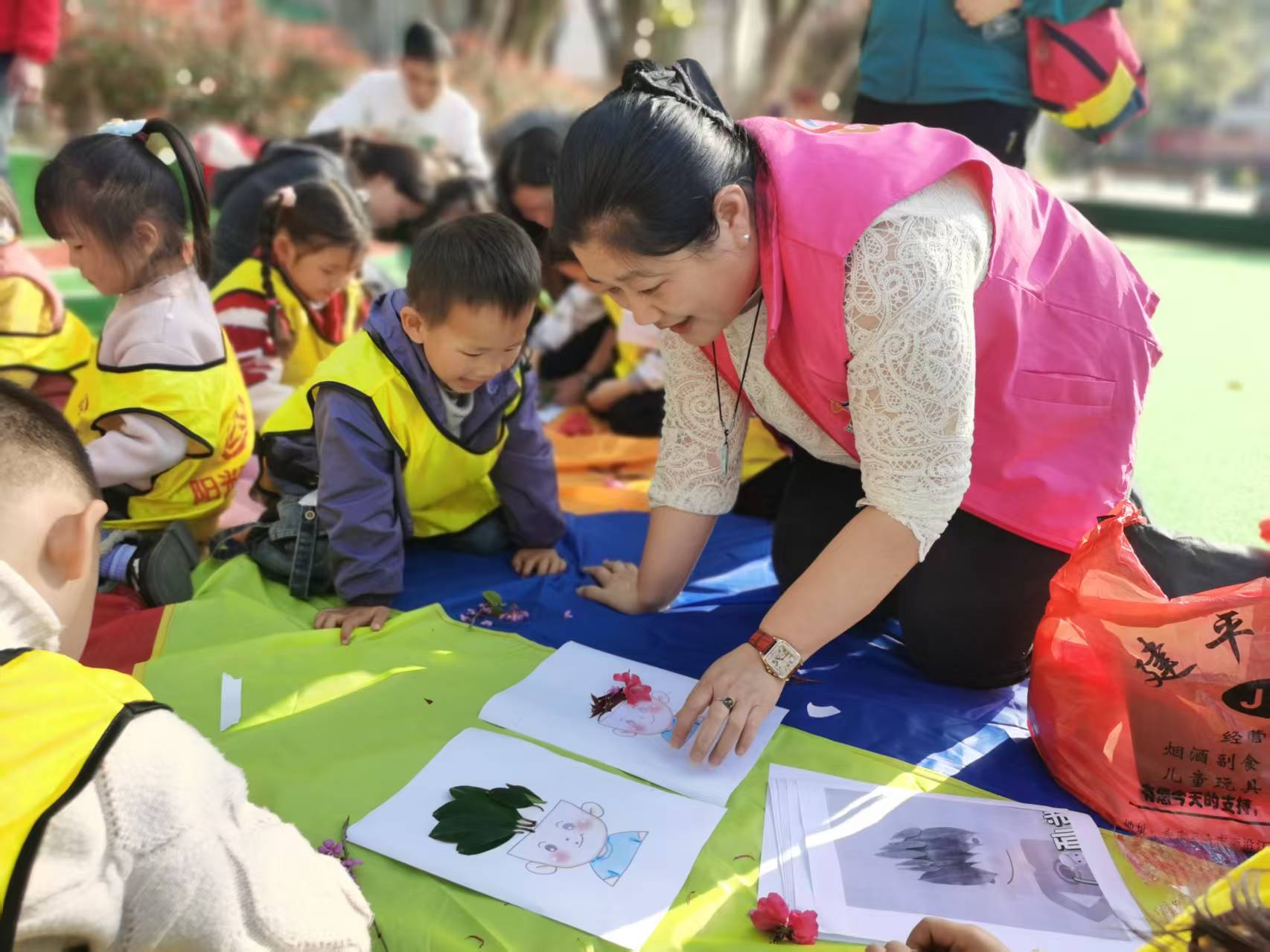 首先,志愿者与爱心妈妈带孩子们来到户外,铺开彩虹伞,大家一起玩丢手绢的游戏。接下来,爱心妈妈鼓励孩子们触感毛绒绒的羽毛、粗糙的树皮等,完成这场大自然的探索之旅。然后孩子们收集好自己喜欢的树叶和花,给小人发型;运用拓印DIY材料,爱心妈妈与孩子们一起合作,把各种植物的颜色拓印在方巾上;与孩子们自由组合在彩虹伞上、大树旁等自己喜欢的空地一起阅读关于自然植物动物的书籍。