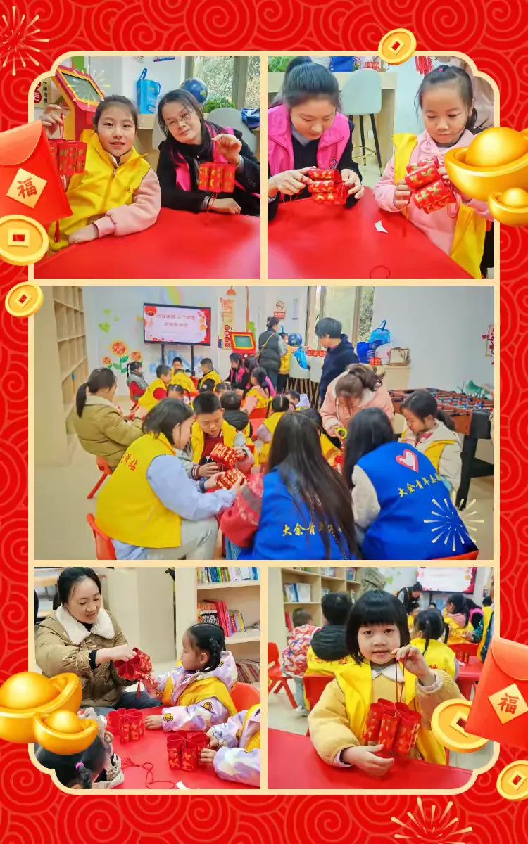 在DIY做灯笼的环节。在爱心妈妈的陪伴下,孩子们分组进行创作。他们用红包、胶带、红绳等工具,制作出一个个别具一格的灯笼。孩子们充分发挥自己的想象力和创造力。这个环节不仅让孩子们学会了手工制作的技巧,更让他们在创作中找到了乐趣和成就感。