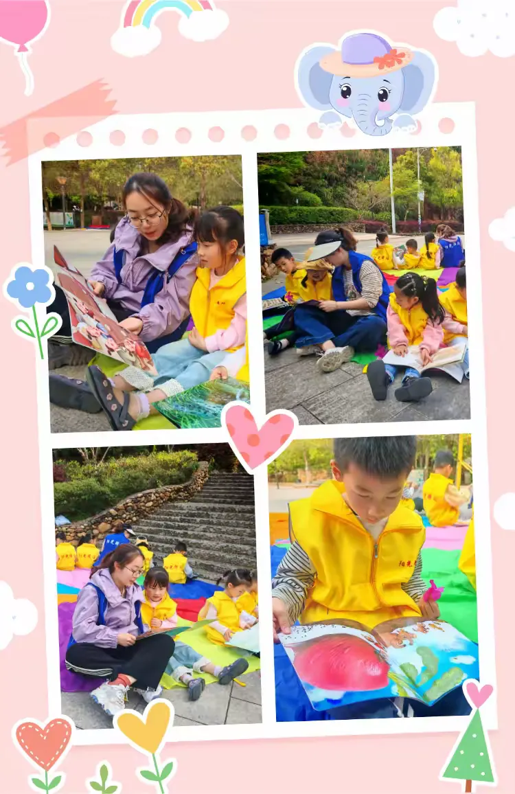 晌午阳光倾泻,彩虹伞如花朵般绽放在阴凉空地。爱心妈妈与孩子们依偎在大树旁、围坐在一起,共读《森林的四季》《昆虫记》等绘本。鸟鸣声伴着书页翻动的轻响,知识与自然在春风中悄然交融。