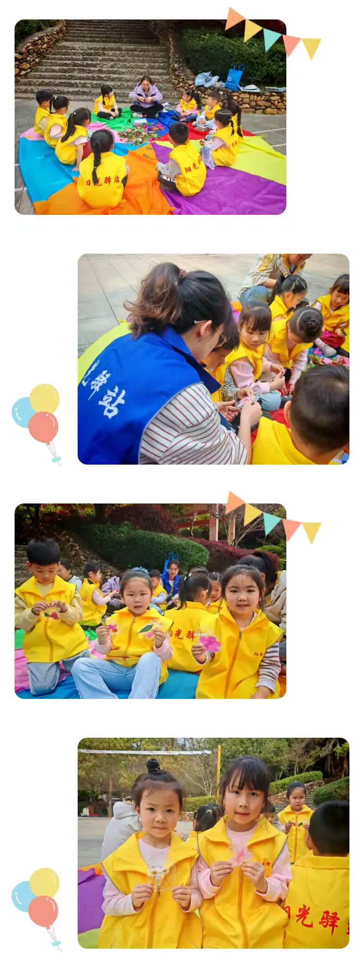 孩子们在爱心妈妈的鼓励下,闭眼触摸树皮的粗糙纹路、轻抚蒲公英的柔软绒毛,用指尖感知自然的馈赠。随后,他们以捡拾的落叶、花瓣为素材,拼贴出独一无二的”自然地图”,记录下探索足迹。