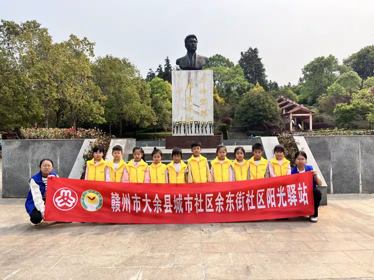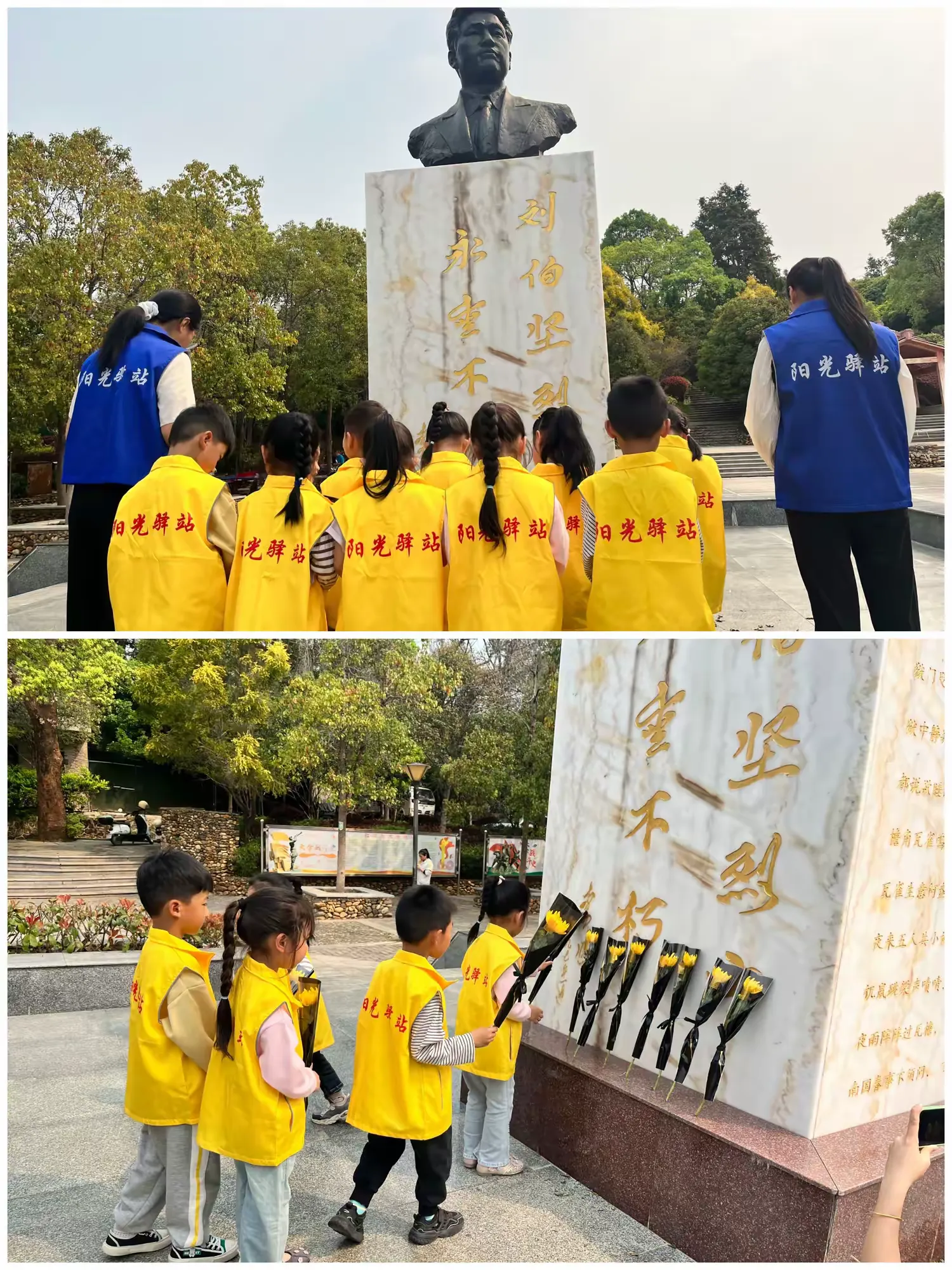 在庄严肃穆的烈士纪念碑前,工作人员和爱心妈妈给孩子们讲述了刘伯坚将军的英雄故事,并献上鲜花,以此方式来祭奠为国家英勇牺牲的先烈们。大家默默致敬,为英雄们的崇高精神而感到敬仰和怀念。