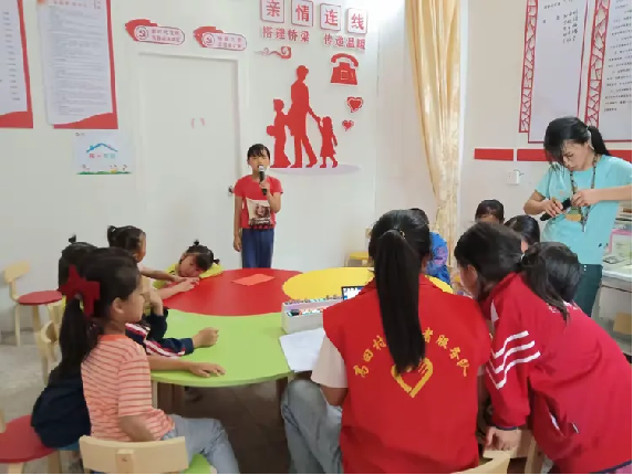 随后,开始了“说词”游戏。工作人员与孩子们围成一个圈,提问“你 喜欢来驿站做什么?”,第一位孩子接词“玩玩具”,第二位孩子们 接词“看图书”,第三位孩子接词“打篮球”以此以类推到最后一位孩子。