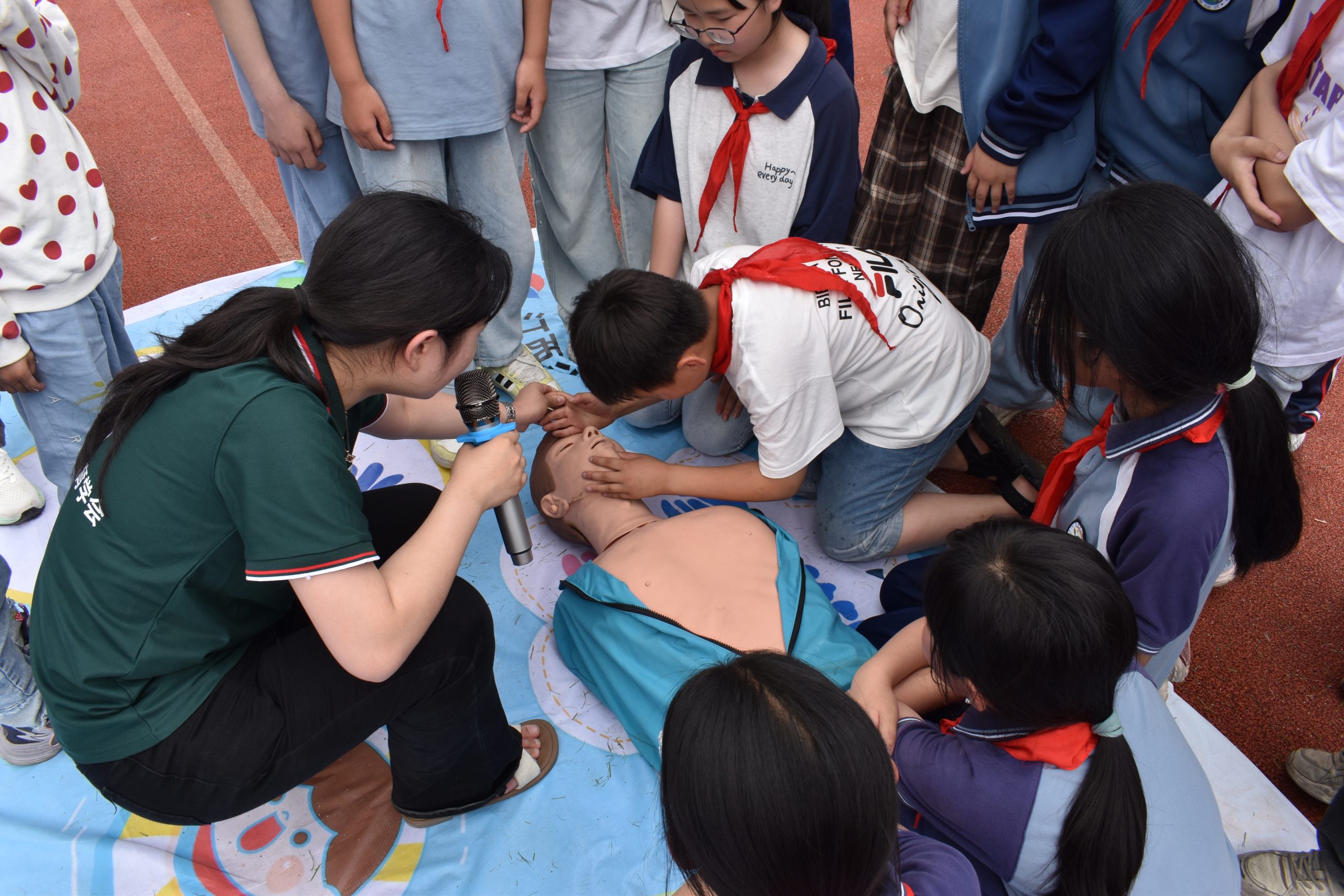 活动现场摆满了救生圈、心肺复苏假人模型和VR眼镜。指导老师一边演示一边吆喝:“救生衣不是随便套的,卡扣得扣紧!”“心肺按压要找准位置,手臂伸直往下压!”孩子们围成一圈,轮流上手练习。有的给假人做人工呼吸,有的互相帮忙系救生衣带子。