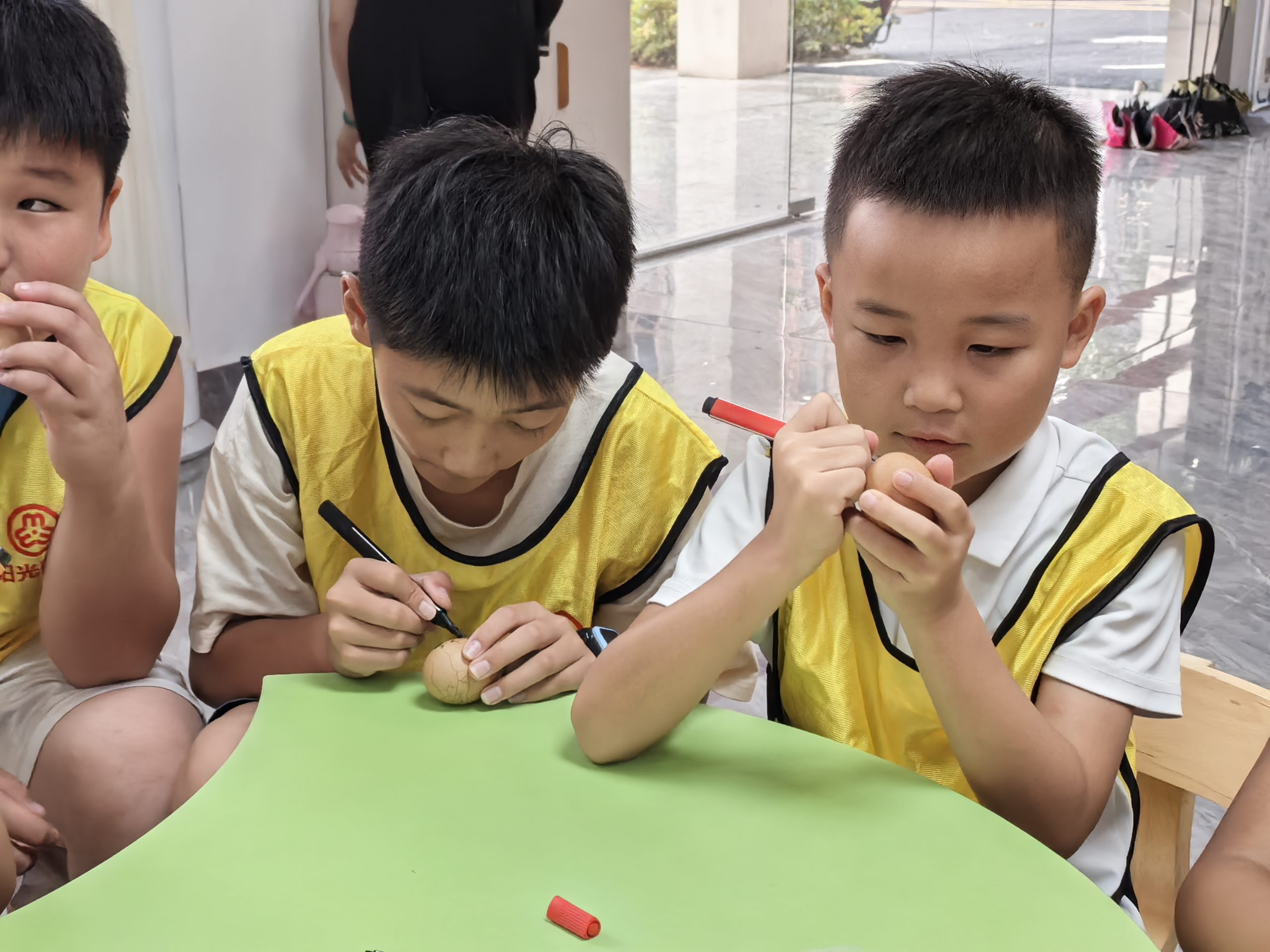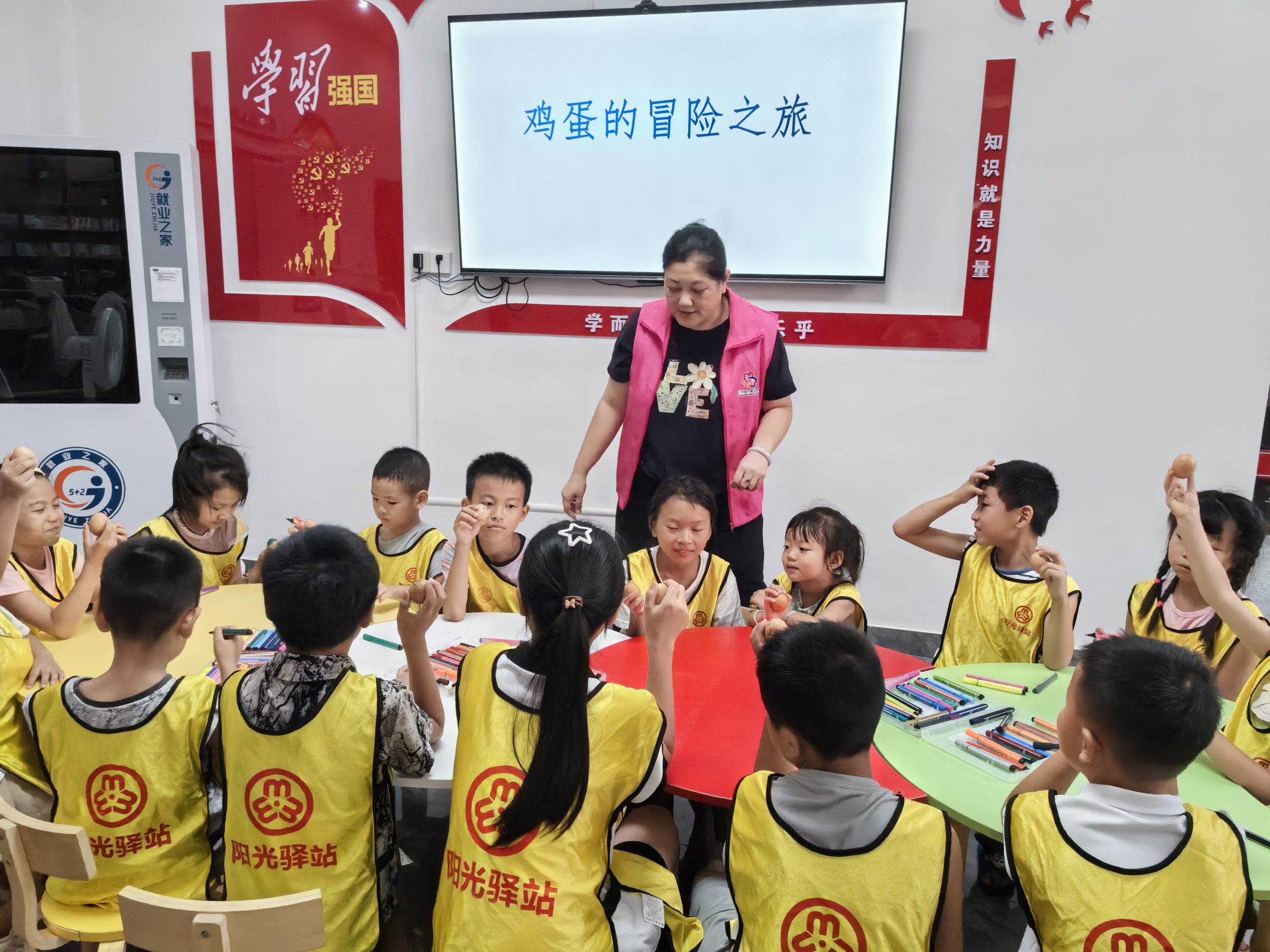 志愿者让小朋友围坐成一圈,用彩色笔在蛋的外壳上做些装饰,并写上自己的名字,每个人展示自己的杰作。把所有的蛋放入一个篮子里,摆在队伍的一端,再把另一个空篮子放在队伍的另一端。然后开展思维导图阅读图书1小时。接下来观看纪录片《跟着书本去旅行》。